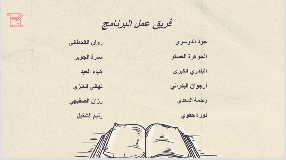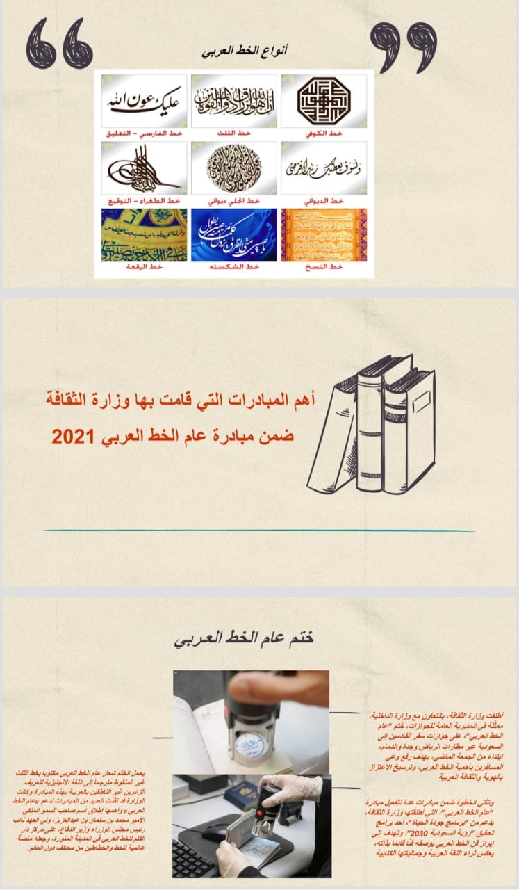 (قدمت وزارة الثقافة مبادرة بعنوان عام الخط العربي ٢٠٢١، تهدف إلى إبراز الخط العربي بوصفه فنا قائما بذاته، وتعزيز ممارسته على مستوى المؤسسات والأفراد، وتوحيد الجهود لخدمته)، بناء على ذلك أقامت وحدة النشاط الطلابي بقسم اللغة العربية تحت رعاية سعادة عميدة كلية العلوم والدراسات الإنسانية بحوطة بني تميم الدكتورة/ حصة بنت سعود الهزاني، برنامجًا بعنوان (عام الخط العربي ٢٠٢١)، وذلك في يوم الأربعاء الموافق ١٤ / ٣ / ١٤٤٣ هـ، في تمام الساعة السادسة مساءً عبر برنامج البلاك بورد، بحضور عددٍ من أعضاء هيئة التدريس والطالبات، أعده وقدمه فريق مميز من الطالبات، بإشراف الأستاذة / نوف راشد العجيري.