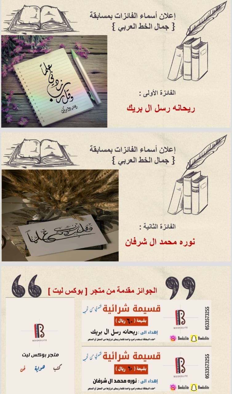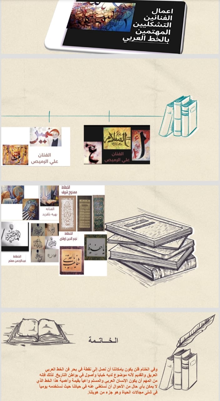 تلا ذلك عرض أعمال الفنانين التشكيليين المهتمين بالخط العربي، ثم خاتمة البرنامج، وإعلان أسماء الفائزات بمسابقة جمال الخط العربي، وأسماء فريق عمل البرنامج.