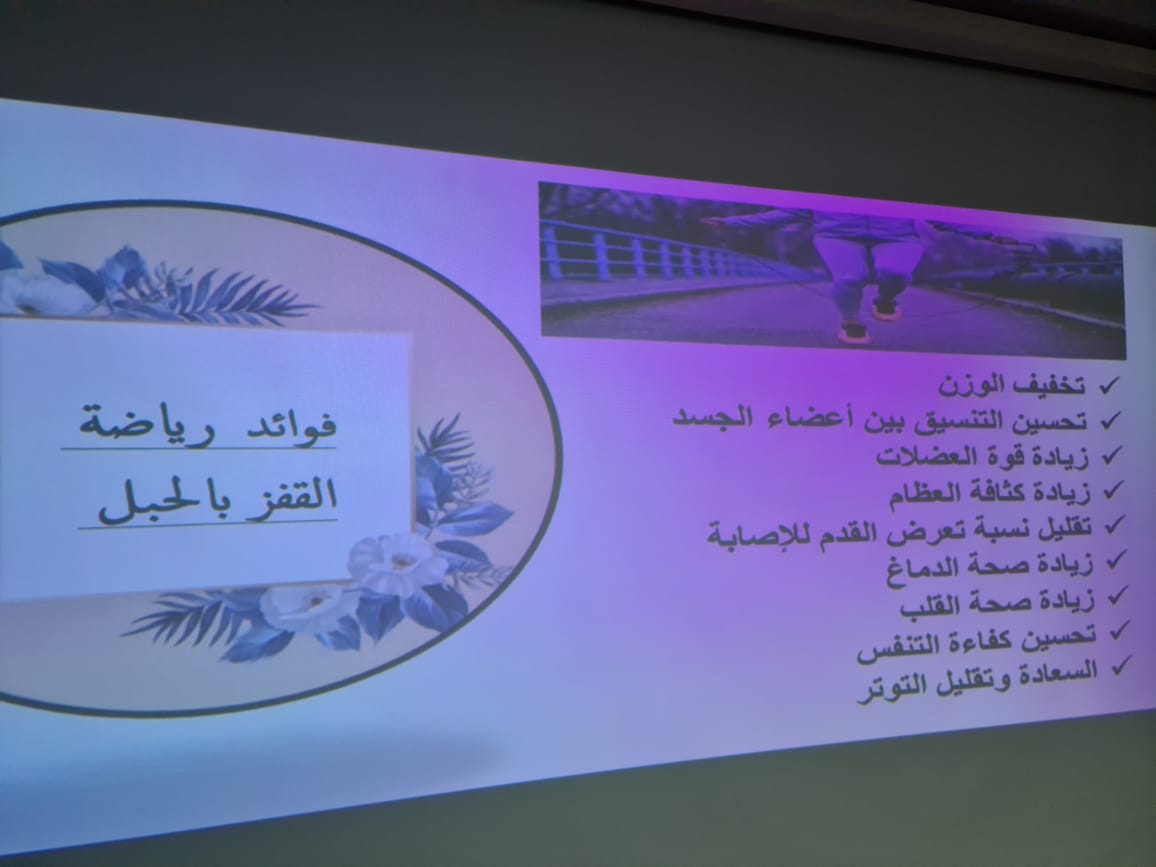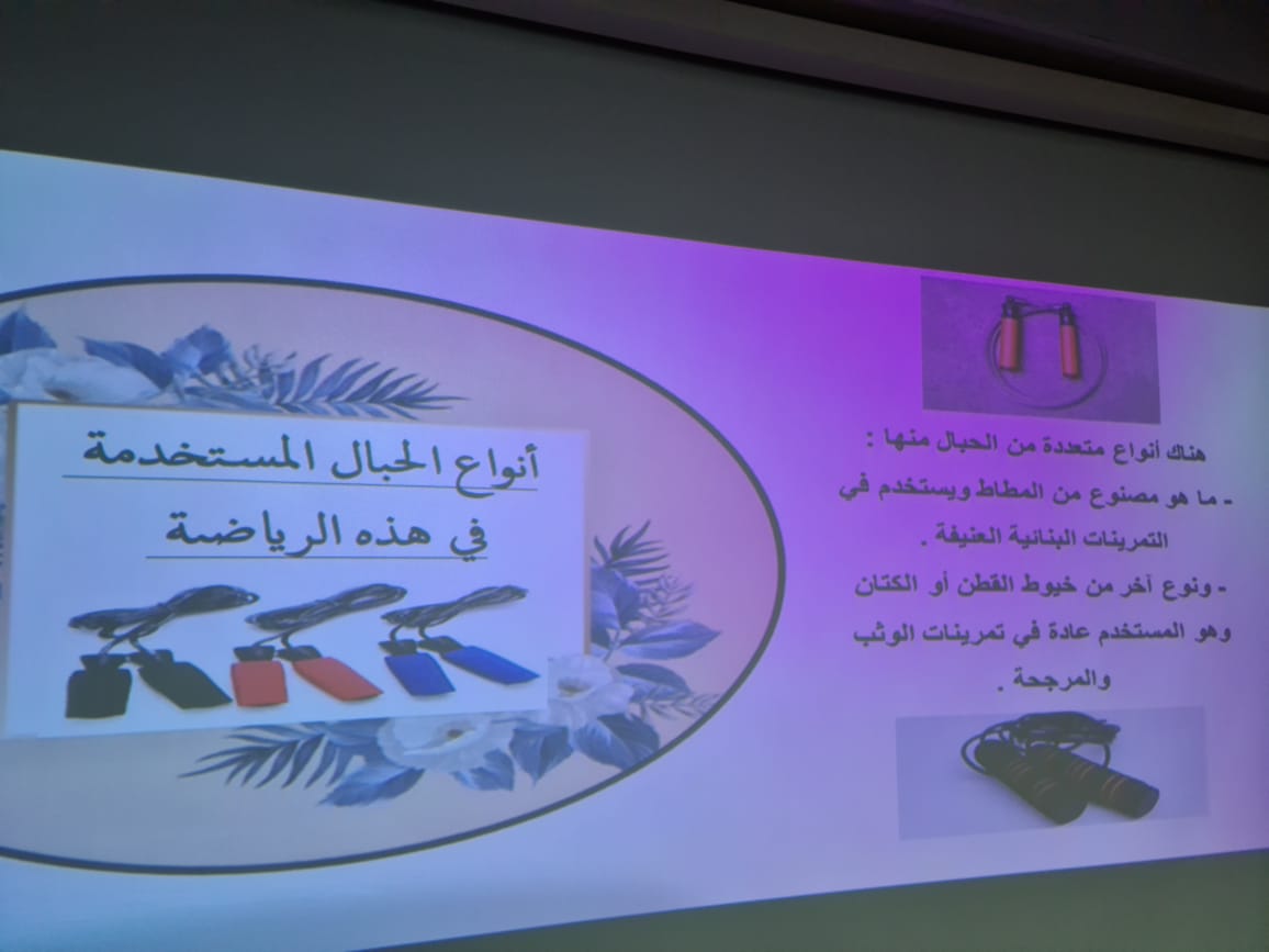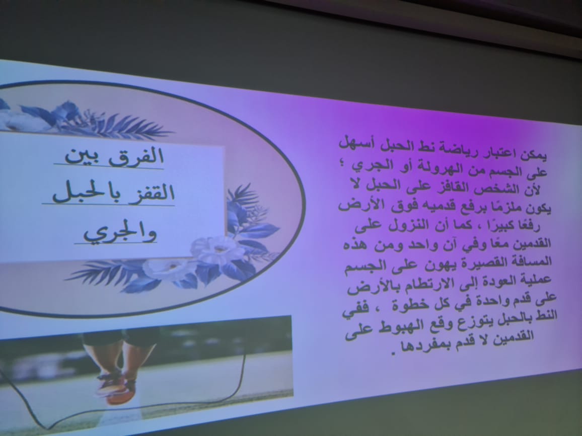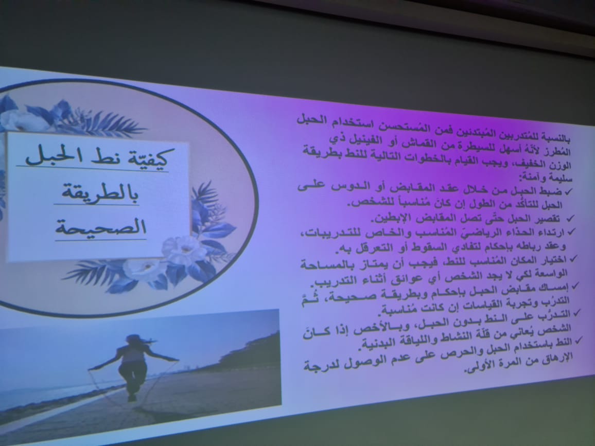 تعتبر رياضة القفز بالحبل من الرياضات التي تساعد على تحريك عضلات الجسم وإكسابه لياقة عالية وحرق للسعرات الحرارية بفاعلية، لذا أقامت وحدة النشاط الرياضي تحت رعاية سعادة عميدة كلية العلوم والدراسات الإنسانية بحوطة بني تميم الدكتورة/ حصة بنت سعود الهزاني، برنامجًا بعنوان (رياضة القفز بالحبل) وذلك في يوم الثلاثاء الموافق ٥ / ٨/ ١٤٤٣ هـ، في تمام الساعة التاسعة صباحًا بحضور عدد من منسوبات الكلية والطالبات.