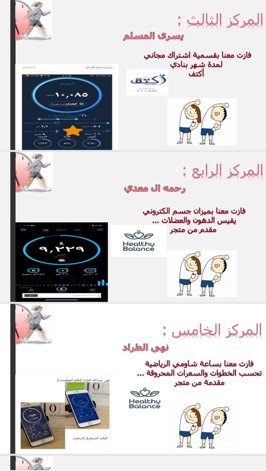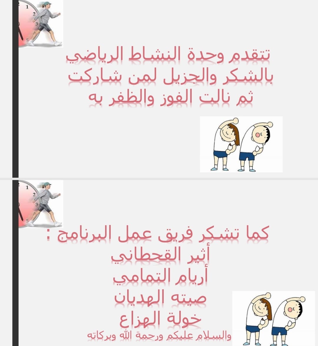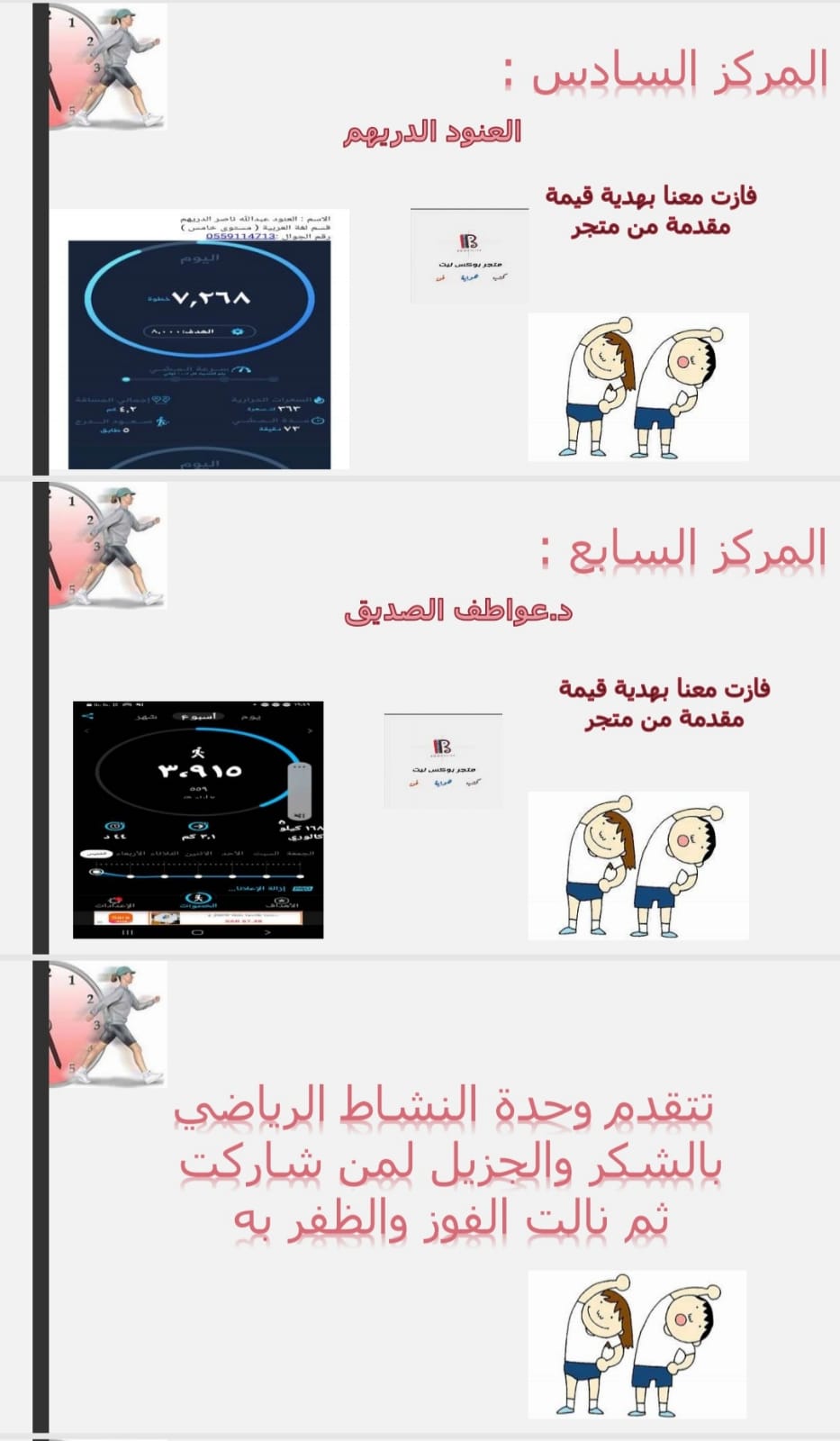(لكل مجتهد نصيب) أقامت وحدة النشاط الرياضي تحت رعاية سعادة عميدة كلية العلوم والدراسات الإنسانية بحوطة بني تميم الدكتورة/ حصة بنت سعود الهزاني، برنامجًا لإعلان نتائج تحدي (المشي وعدّاد الخطوات) وذلك في يوم الأربعاء الموافق ١٢ / ٤ / ١٤٤٣ هـ، في تمام الساعة السادسة مساءً بحضور عدد من أعضاء هيئة التدريس والطالبات. عبر برنامج البلاك بورد أعده وقدمه فريق مميز من الطالبات هن: أثير القحطاني، صيته الهديان، أريام التمامي، خولة الهزاع، بإشراف من مشرفة النشاط الرياضي الأستاذة / نوف راشد العجيري.
