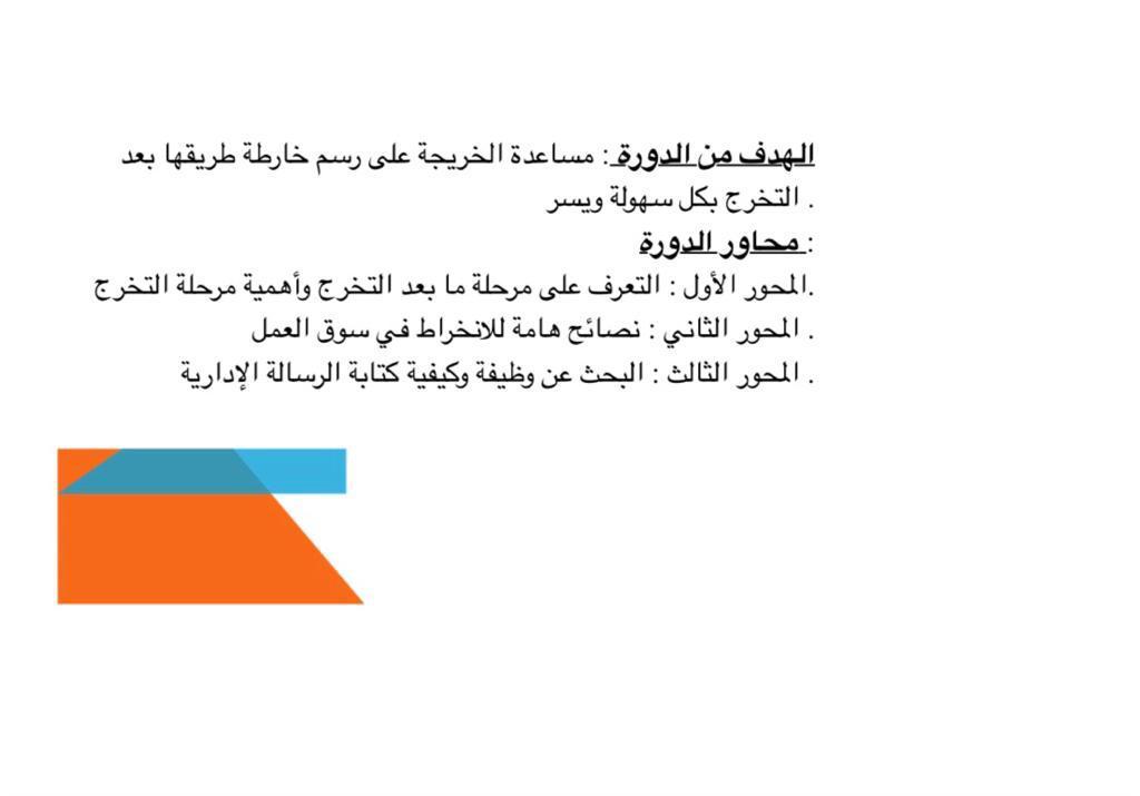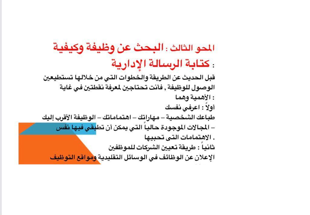 المحور الثالث البحث عن وظيفة من خلال العمل التطوعي أو مقابلات مع متخصصات والمتابعة لما هو جديد وحضور الفعاليات والمناسبات ومواقع التواصل الاجتماعي وأخيرا كيفية كتابة الرسالة الإدارية.