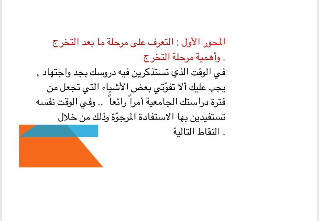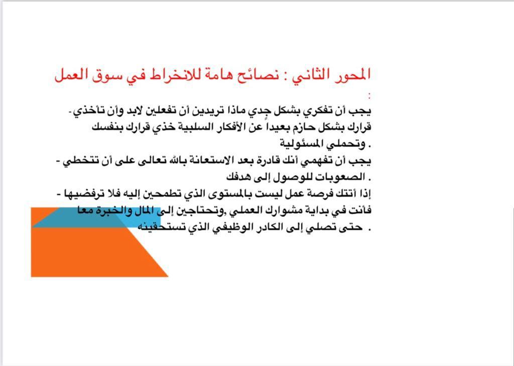 المحور الثاني: نصائح هامة للانخراط في سوق العمل حيث تم حث الطالبات على قبول الفرصة الموجودة واعتبارها فترة تدريب لصقل الخبرات واختبار للقدرات في هذا المجال.