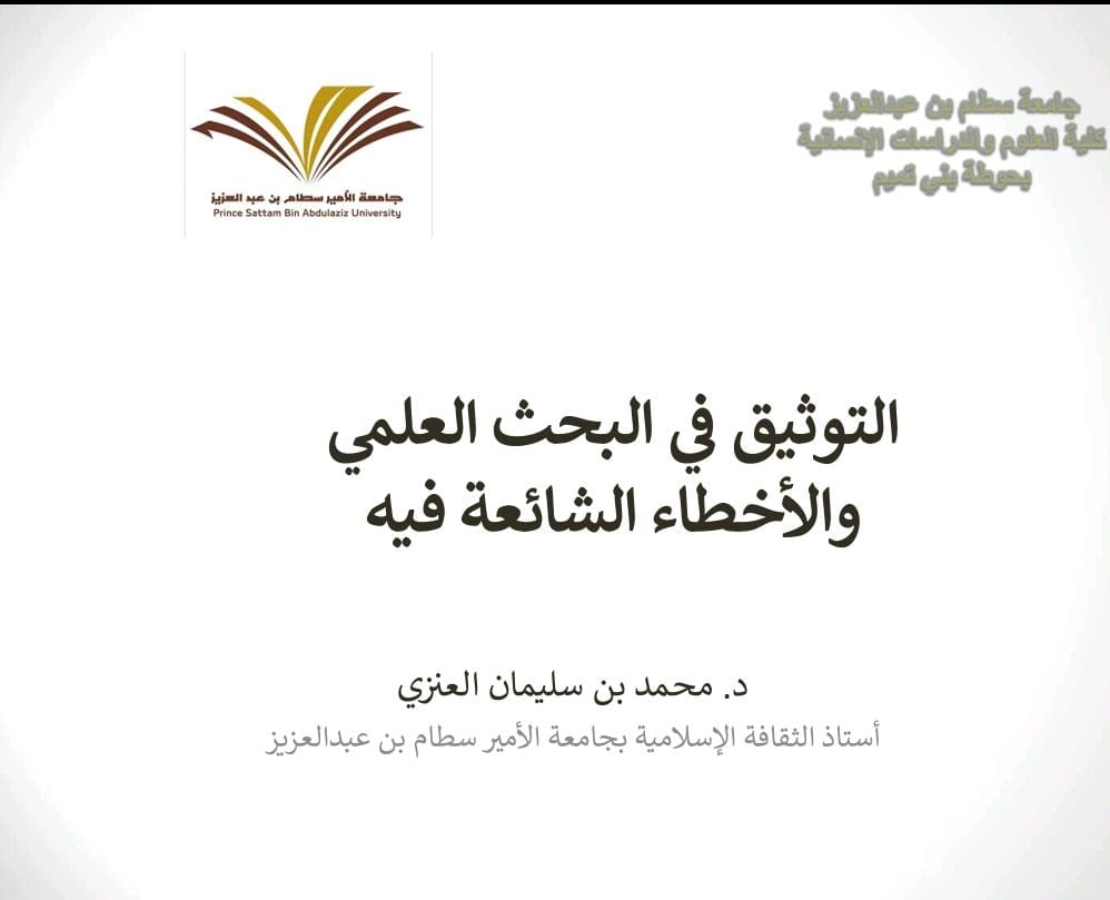 يعد البحث العلمي من أول اهتمامات الصروح الأكاديمية لما له من أهمية في علو شأن الجامعات والطلاب المنتسبين إليها ففي يوم الاثنين الموافق: 1443/8/4هـ تحت رعاية عميدة كلية العلوم والدراسات الإنسانية بحوطة بني تميم د. حصة بنت سعود الهزاني أقيمت دورة بعنوان (التوثيق في البحث العلمي والأخطاء الشائعة فيه) على برنامج البلاك بورد ألقاها أستاذ الثقافة الإسلامية المساعد د. محمد بن سليمان العنزي.