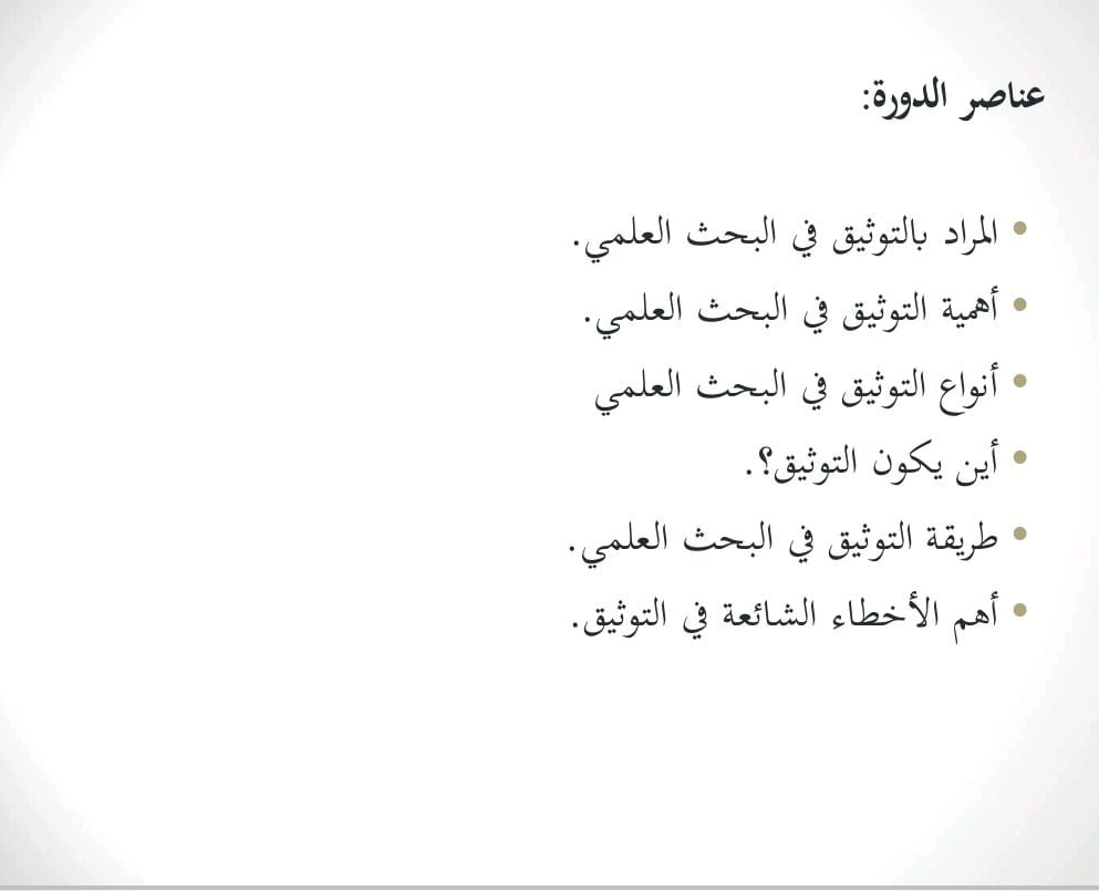 وقد هدفت الدورة إلى: - معرفة أهمية التوثيق في البحث العلمي وطرقه.