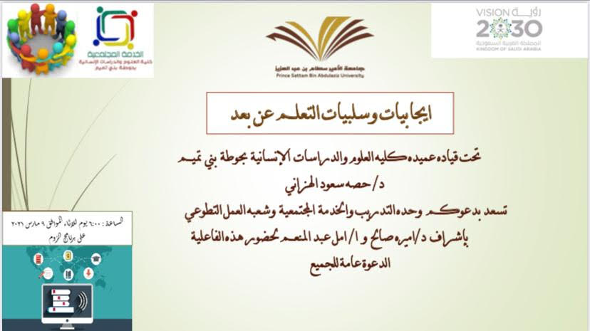 إن التعليم عن بعد يحقق السلامة للطلبة والمدرسين، والوقاية من فيروس كورونا، حيث أقامت وحدة التدريب والخدمة المجتمعية وشعبة العمل التطوعي _طالبات قسم الكيمياء دورة بعنوان" إيجابيات وسلبيات التعلم عن بعد" تحت رعاية عميدة كلية العلوم والدراسات الإنسانية بحوطة بني تميم د/حصة بنت سعود الهزاني، وذلك في يوم الأربعاء الموافق: 1442/7/26هـ، في تمام الساعة 6 مساء خلال برنامج الزووم، بإشراف د/ أميرة صالح و أ/ أمل عبد المنعم، حضرت الندوة 12طالبة من قسم الكيمياء.