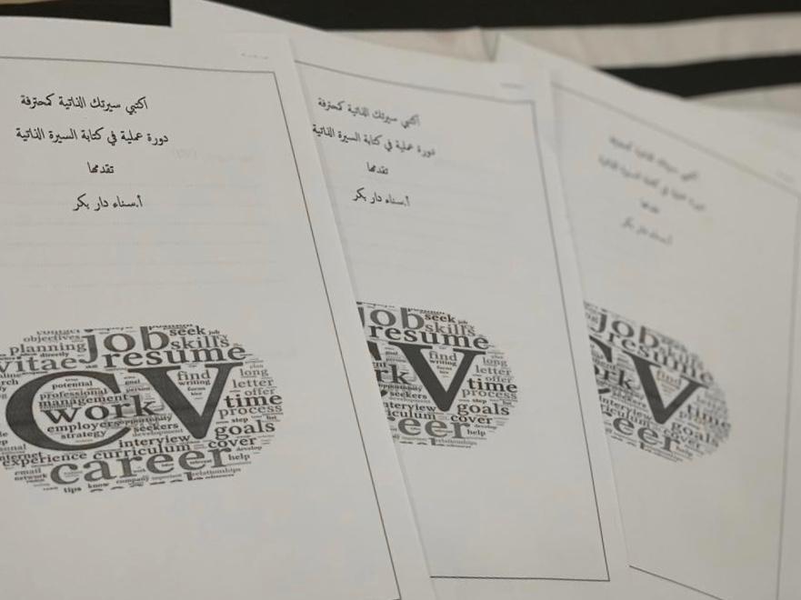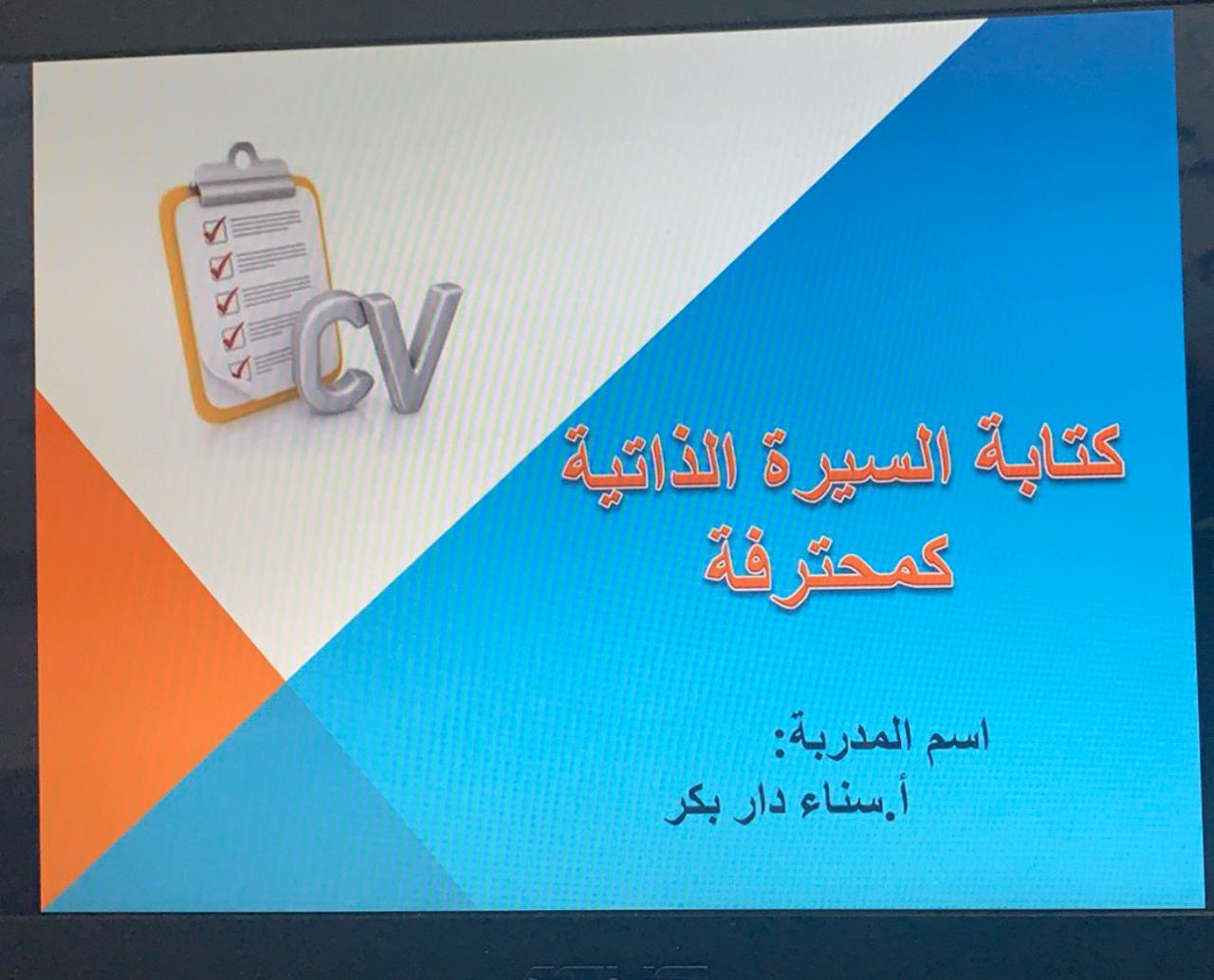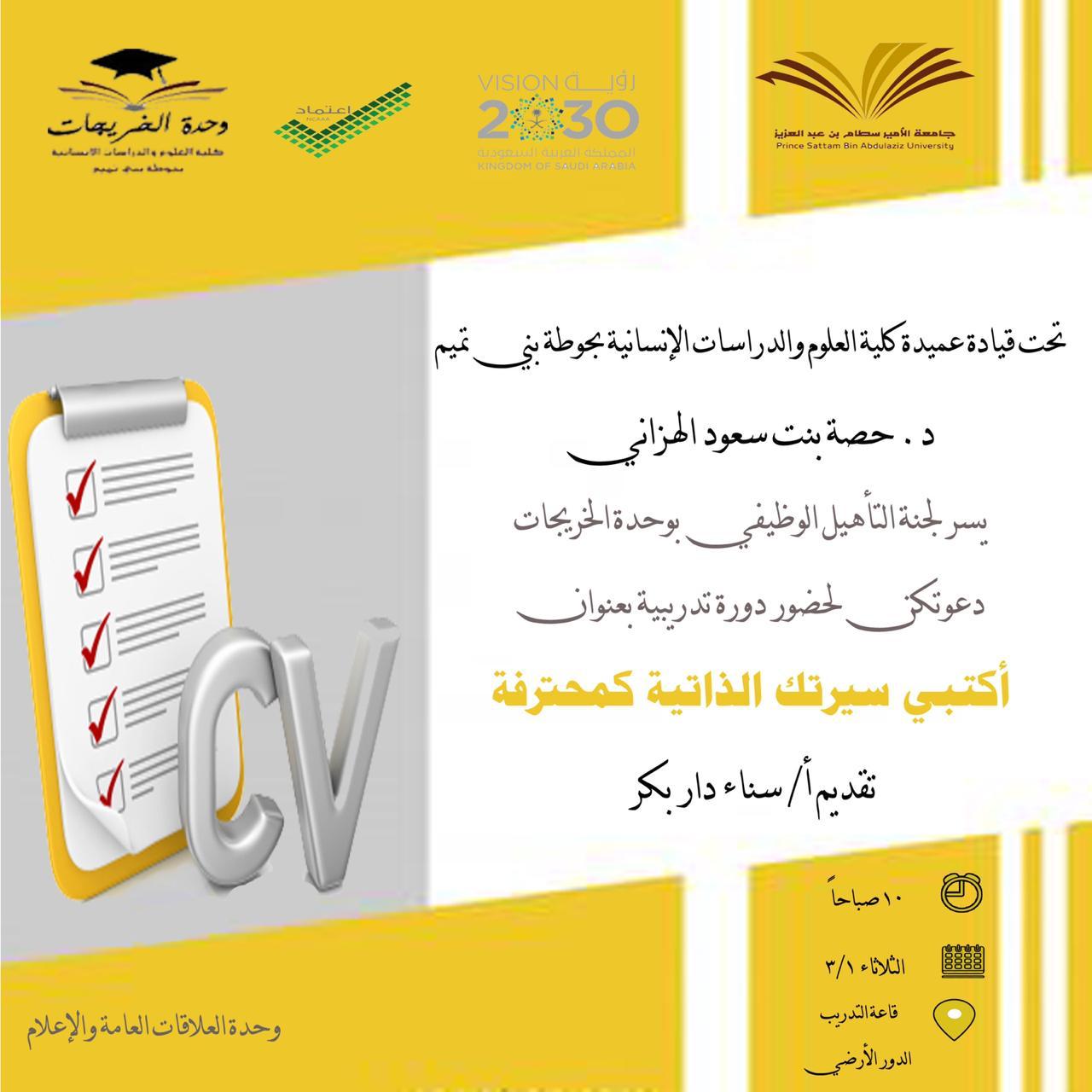 أقامت وحدة الخريجات متمثلة بلجنة التأهيل الوظيفي بكلية العلوم والدراسات الإنسانية بحوطة بني تميم ورشة عمل بعنوان:( اكتبي سيرتك الذاتية كمحترفة) تحت قيادة عميدة الكلية سعادة الدكتورة/ حصة بنت سعود الهزاني في يوم الثلاثاء الموافق :١-٣-١٤٤١ هـ بقاعة التدريب من تقديم ا/ سناء دار بكر محاضر بقسم اللغة الإنجليزية بالكلية، وحضر ورشة العمل خمسة و أربعون طالبة، كما حضر اللقاء عدد ثلاثة من أعضاء هيئة التدريس بالكلية. وهدفت إلى تأهيل الطالبات المشاركات لسوق العمل من خلال التدريب بشكل عملي على كتابة السيرة الذاتية، وتزويدهم بأهم المعلومات والتوجيهات اللازمة لتصميم وكتابة اﻟﺳﯾرة الذاتية، واﻟرﺳﺎﻟﺔ التعريفية باحترافية، حيث تمكنت الطالبات في نهاية ورشة العمل من تصميم و كتابة السيرة الذاتية الخاصة بهن. ولاقت الورشة تفاعلاً كبيراً من قبل الطالبات وأعضاء هيئة التدريس.