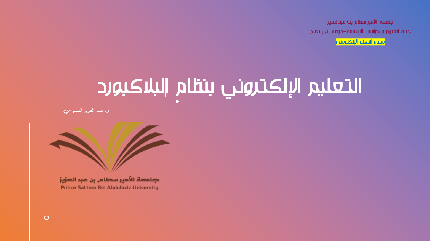 قدم الدورة د. عبد العزيز السنوسي المدرب المعتمد بعمادة التعلم الإلكتروني، وقد تناولت الدورة التعريف بنظام التعلم الإلكتروني بلاك بورد: واجهته الرئيسية وعناصر قائمة المقرر وركزت على تقديم الواجبات وأداء الاختبارات وتنزيل المحتوى والتواصل مع أساتذة المقررات.