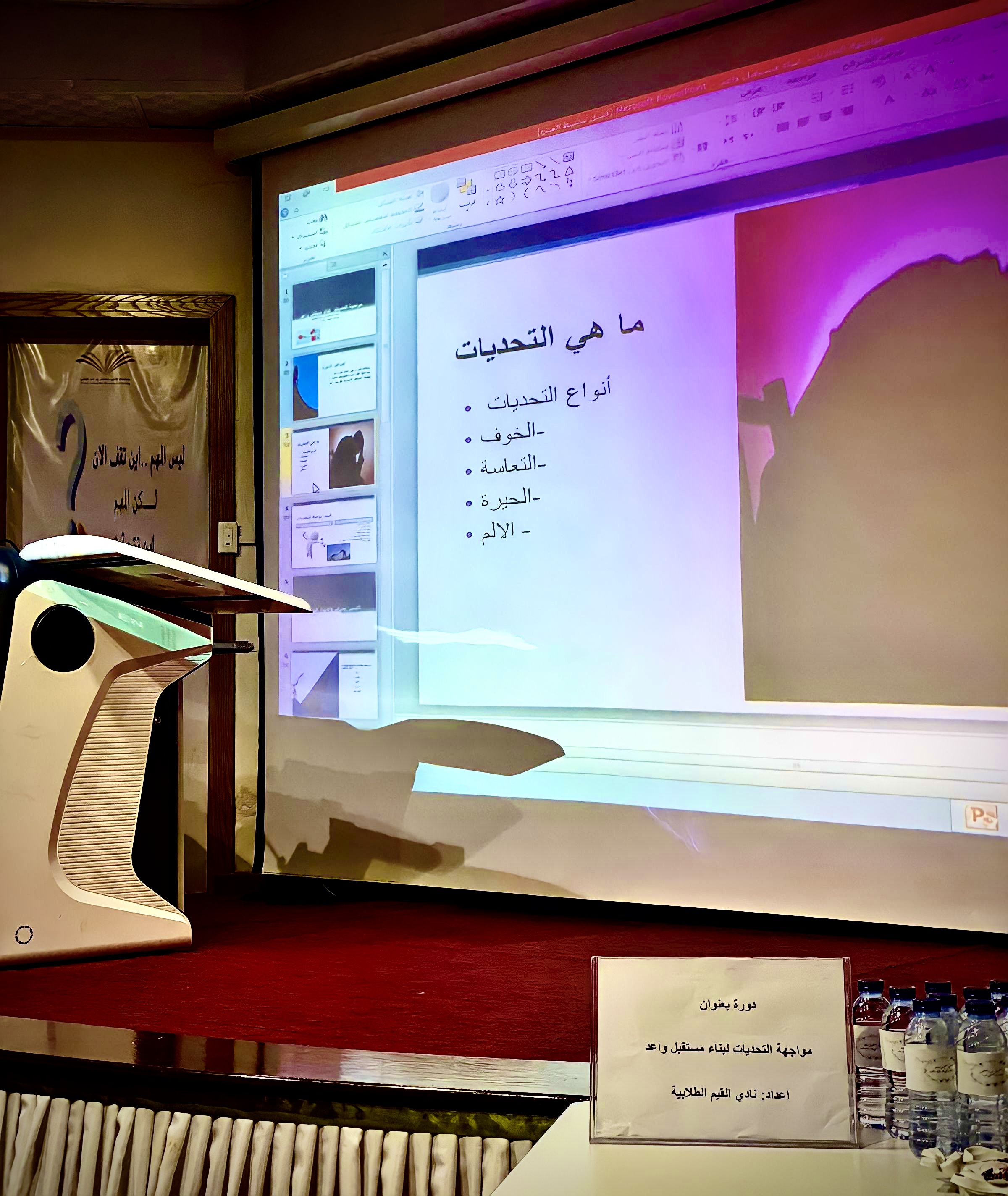 تعتبر التحديات من أهم المشاكل التي تواجه تقدم الطالبة في حياتها الخاصة، ومسيرتها العلمية، ولمواجهة هذه التحديات بطريقة علمية والاستفادة من تجارب الآخرين أقام نادي القيم الطلابية بكلية العلوم والدراسات الإنسانية تحت رعاية عميدتها الدكتورة حصة بنت سعود الهزاني، دورة تدريبية بعنوان (مواجهة التحديات لبناء مستقبل واعد) إعداد طالبات نادي القيم وإشراف أ.فايزة سالم بمسرح الكلية اليوم الاربعاء،الموافق1444/3/16هـ الساعة 9:30 صباحًا.