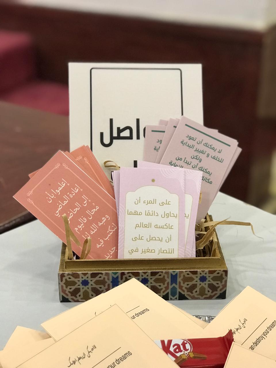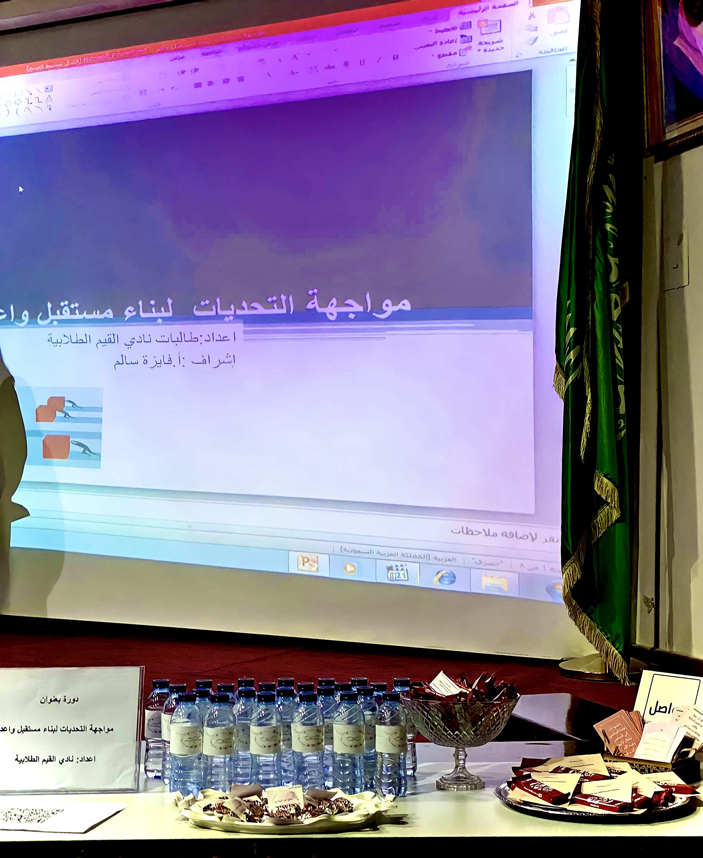 كما تمت مشاركة لبعض الطالبات من خلال التسجيل الصوتي لتحديات ومعوقات استطعن التغلب عليها مما ساهم في تشجيع الحضور على النقاش والبحث عن حلول عملية وجذرية لمشاكلهن، وعرضت بعض الطالبات تحديات تم تجاوزها خلال دراستها، وفي ختام الدورة تم تقديم توزيعات بعبارات إيجابية تحث على العزم والتحدي.