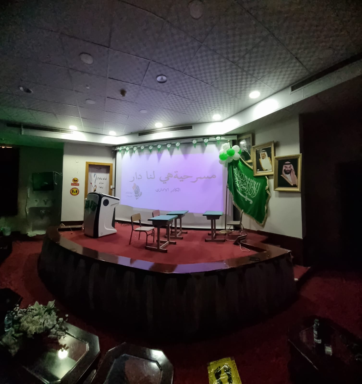 كما نظم الكادر الإداري برنامجاً بعنوان مسرحية هي لنا دار حيث ركزت على مراحل التعليم والمسيرة التاريخية التي مرت بها إلى أن وصل للنهوض الملموس والعهد الفخري لعهد زاهر ورمز عامر وجهود المملكة في ظل جائحة كورونا أدام الله عز مملكتنا وأمنها.