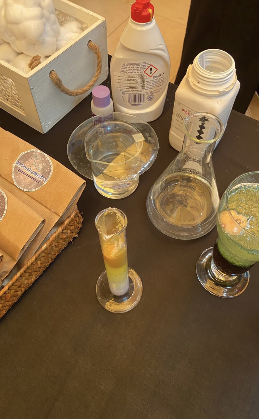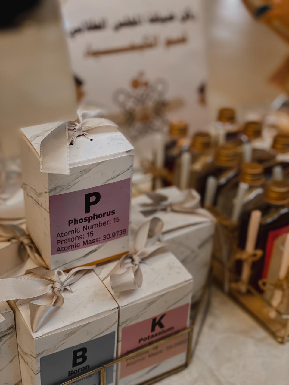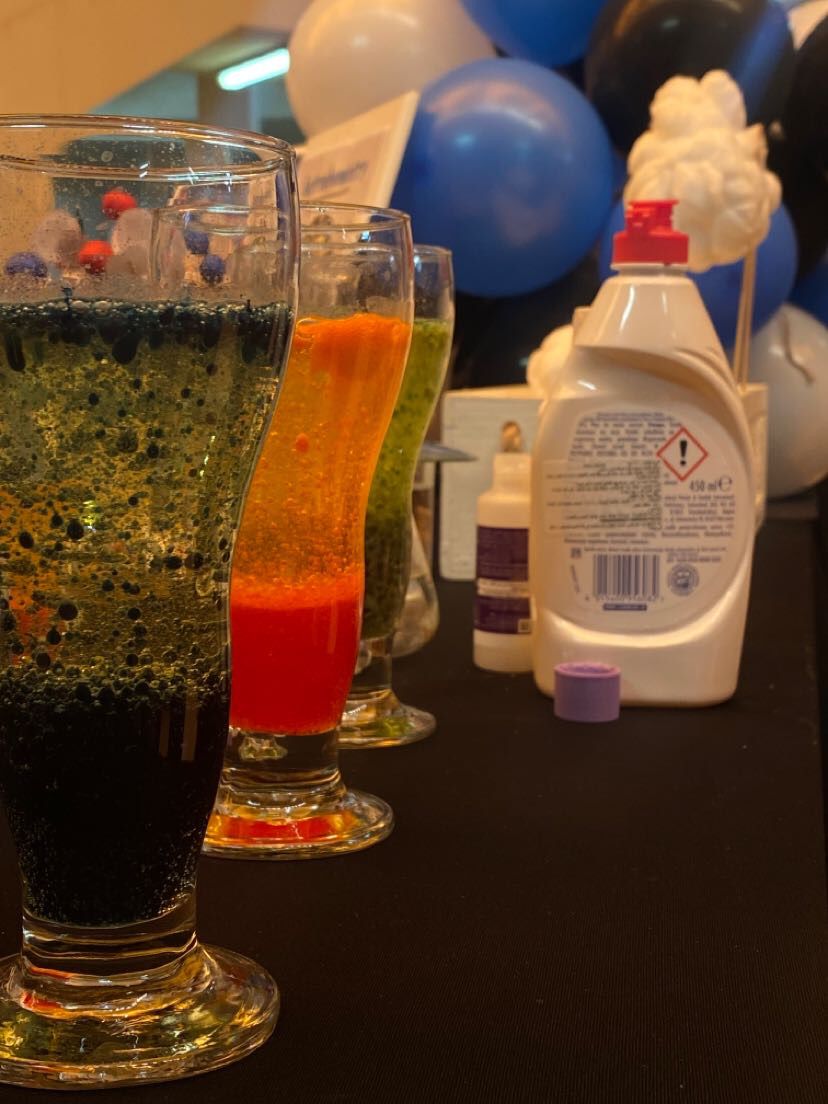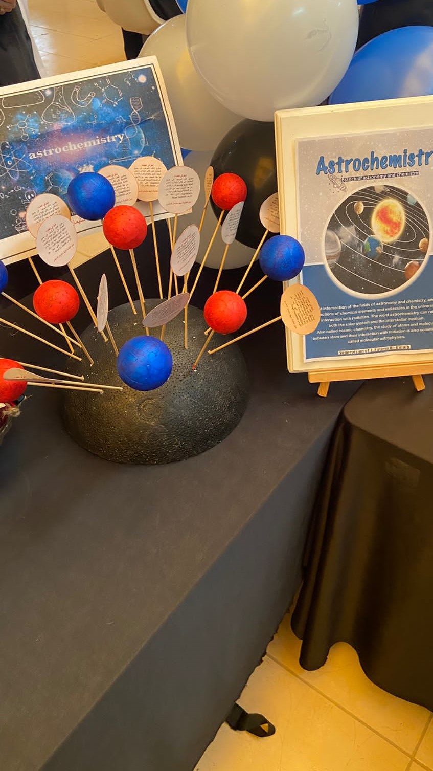 ثالثاً: ركن الكيمياء الفلكية والعناصر الكيميائية الموجودة في الفضاء الخارجي بإشراف أ. فاطمة الكليب حيث تم شرح جهاز التحليل الطيفي وهو من أهم إحدى الجوانب في الكيمياء الفلكية وأيضاً احتوى الركن على عدد من التجارب مثل تجربة الأمطار الذهبية اللي تمثل لنا انتشار العناصر الكيميائية في الفضاء وتجربة الفوار مع الزيت وتجربة نافورة الصابون.