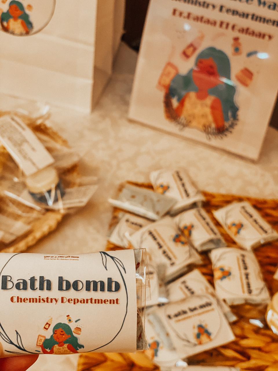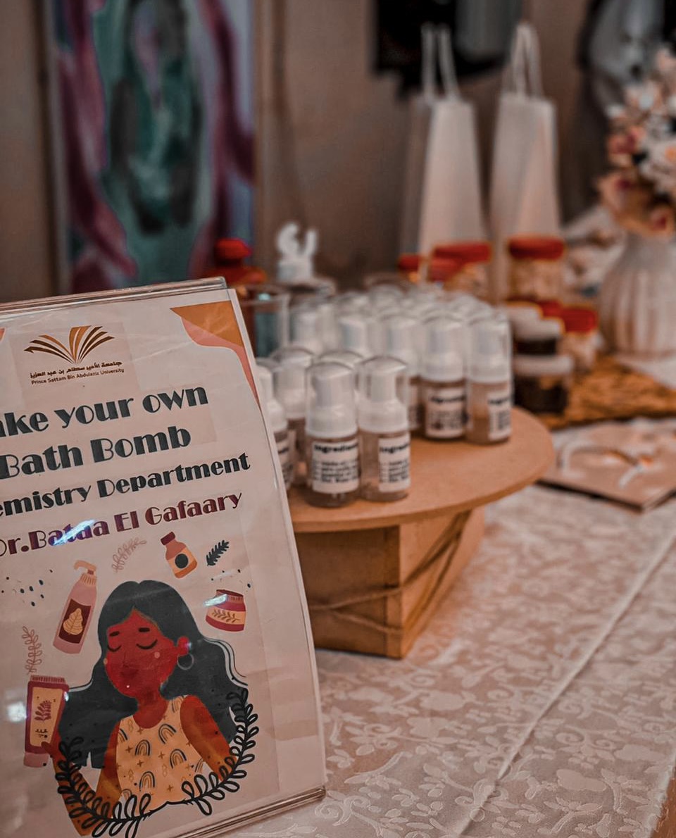 ثانيًا: ركن صناعة منتجات العناية بالبشرة بإشراف أ. باتعة الجعفري حيث تم عمل صابون رغوي مرطب للبشرة والكرات المتفجرة بمكونات صحية وورود مجففة، وسكراب من القهوة لمعالجة مشاكل البشرة ومرطب من زبدة الشيا وزيت اللوز الحلو وزيوت عطرية وقامت الطالبات بتوزيع عينات صغيرة من كل المنتجات وكتابة المكونات عليها للاستفادة.