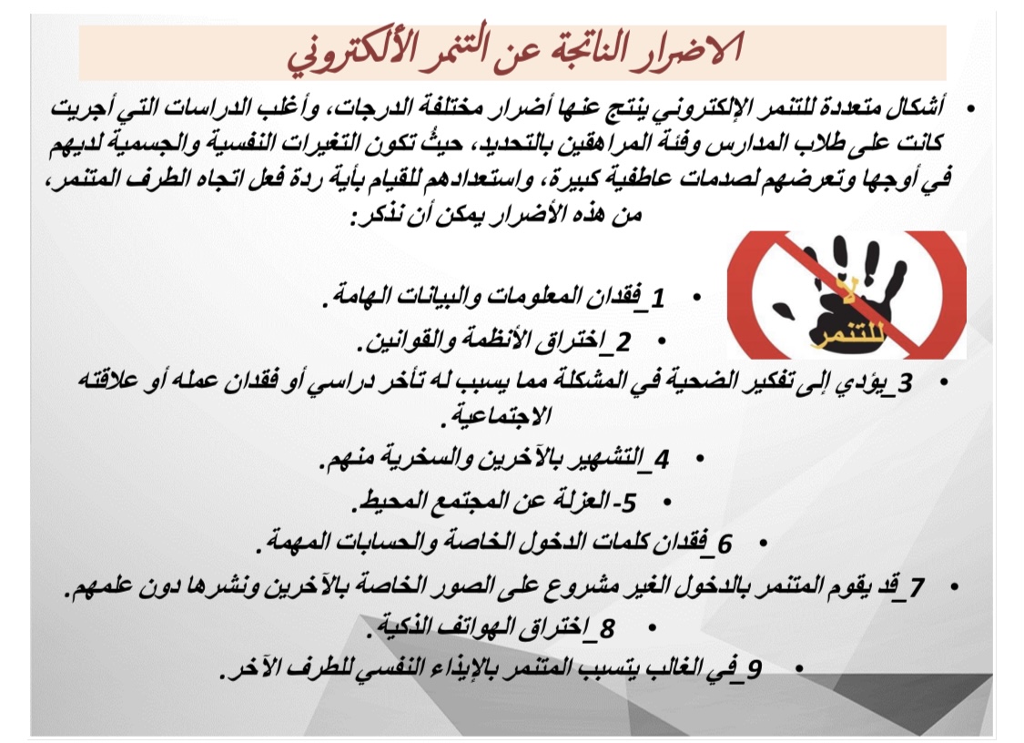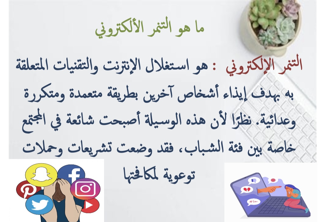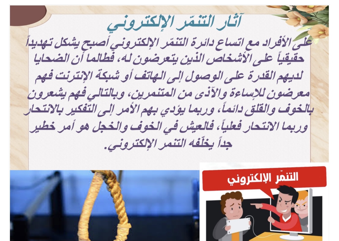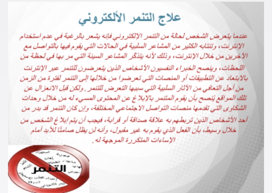 التنمر هو واحد من أخطر الظواهر التي قد يتعرض لها الأنسان في حياته ويسبب له الكثير من الأذى النفسي؛ حيث أقامت وحدة التدريب والخدمة المجتمعية وشعبة العمل التطوعي _طالبات قسم اللغة العربية حملة بعنوان" التنمر الإلكتروني" تحت رعاية عميدة كلية العلوم والدراسات الإنسانية بحوطة بني تميم د/حصة بنت سعود الهزاني، وذلك في يوم الاثنين الموافق:١٤٤٢/٨/١٨ هـ، في تمام الساعة الرابعة مساءً عبر برنامج الزووم، و بإشراف د/ أميرة صالح ومشاركة طالبات قسم اللغة العربية. تناولت الندوة أساليب التنمر الإلكتروني وأثره على الفرد والمجتمع كما تناولت الآثار النفسية على المتنمر عليه، وكيفية معالجة الاثار السلبية  لتلك الظاهرة والالتزام بالقيم الدينية والخلقية والأعراف المجتمعية.