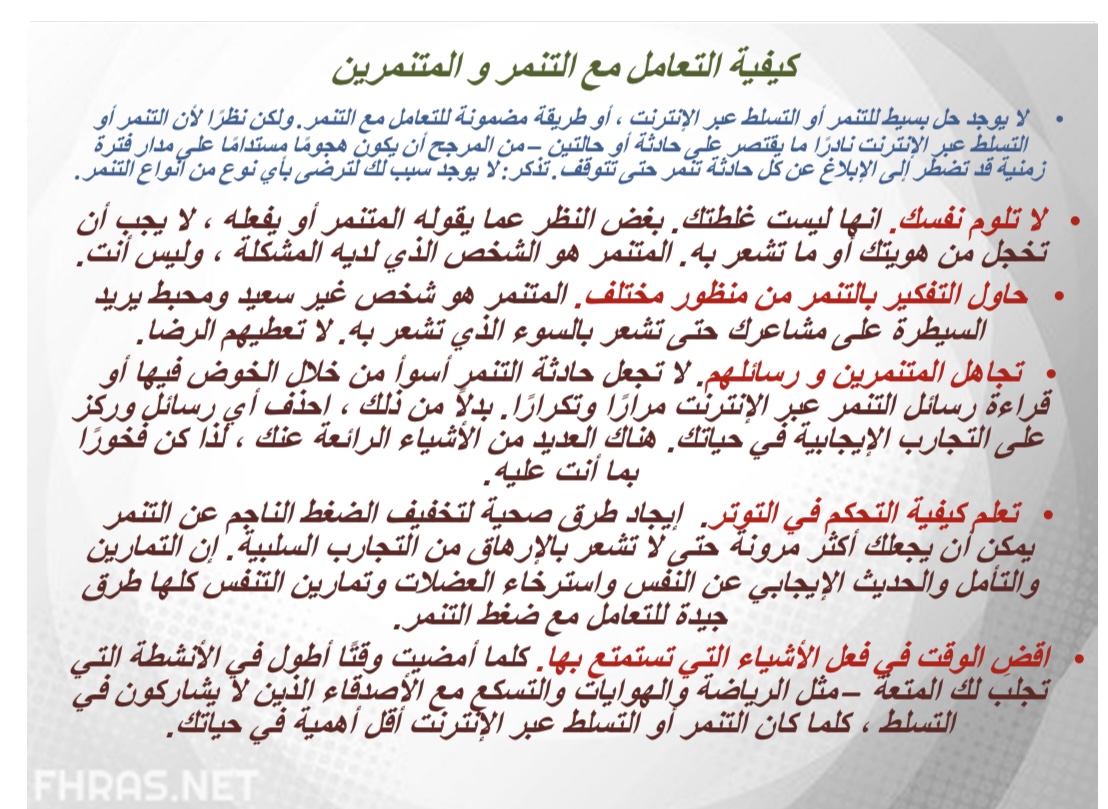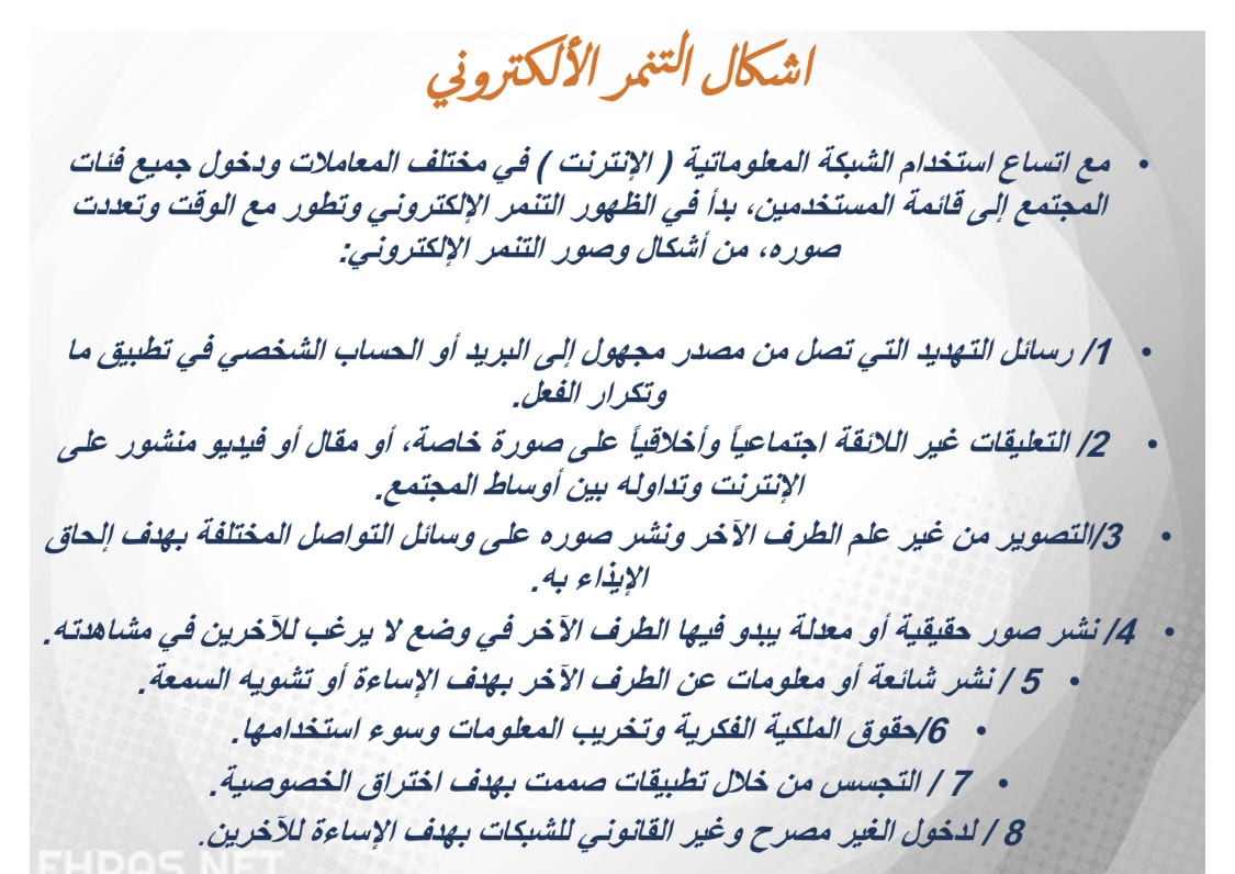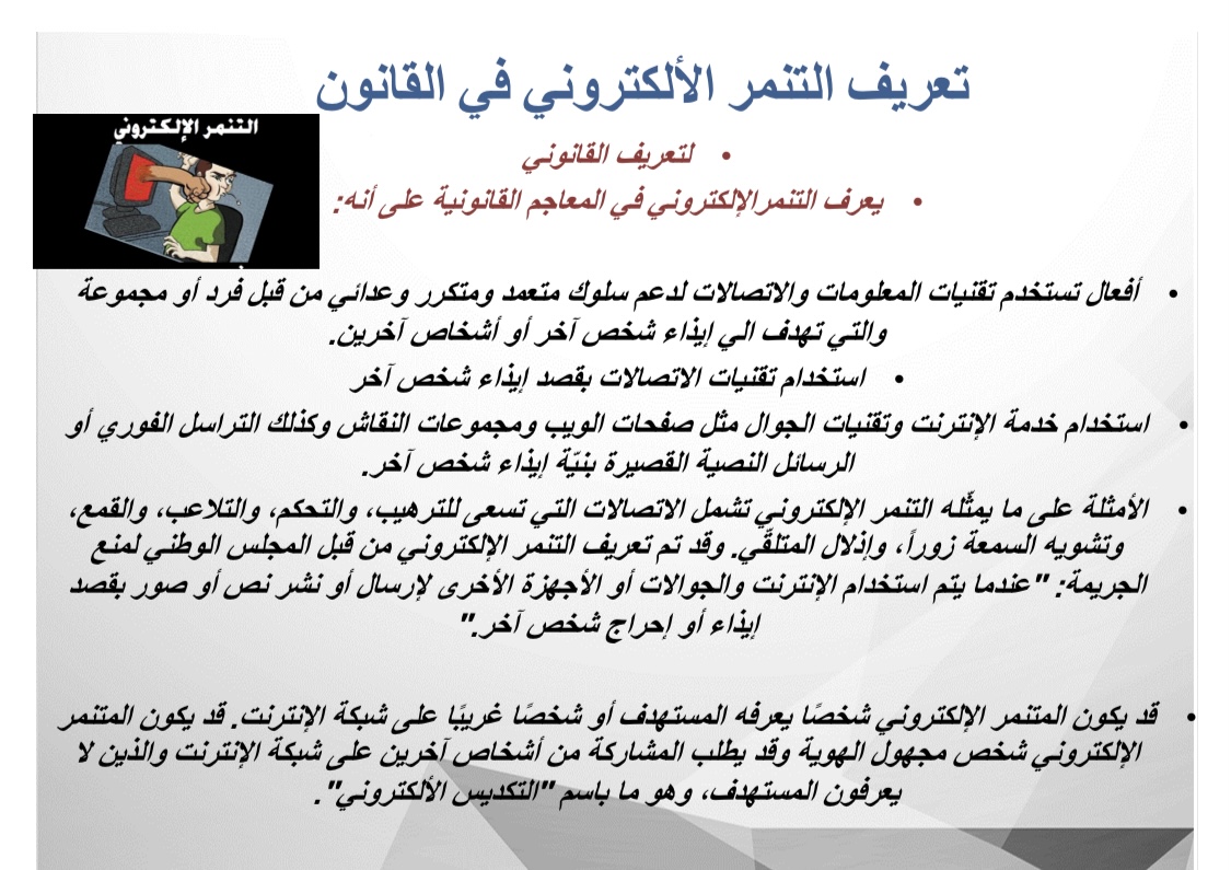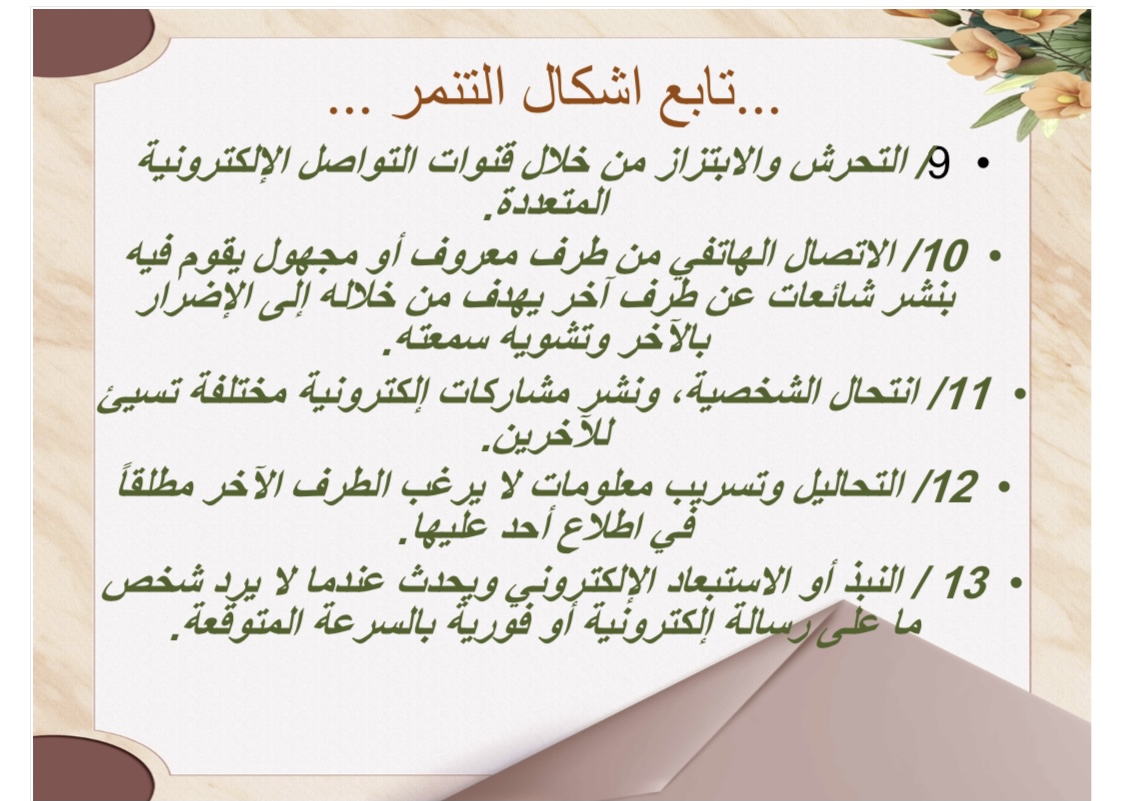 التنمر هو واحد من أخطر الظواهر التي قد يتعرض لها الأنسان في حياته ويسبب له الكثير من الأذى النفسي؛ حيث أقامت وحدة التدريب والخدمة المجتمعية وشعبة العمل التطوعي _طالبات قسم اللغة العربية حملة بعنوان" التنمر الإلكتروني" تحت رعاية عميدة كلية العلوم والدراسات الإنسانية بحوطة بني تميم د/حصة بنت سعود الهزاني، وذلك في يوم الاثنين الموافق:١٤٤٢/٨/١٨ هـ، في تمام الساعة الرابعة مساءً عبر برنامج الزووم، و بإشراف د/ أميرة صالح ومشاركة طالبات قسم اللغة العربية. تناولت الندوة أساليب التنمر الإلكتروني وأثره على الفرد والمجتمع كما تناولت الآثار النفسية على المتنمر عليه، وكيفية معالجة الاثار السلبية  لتلك الظاهرة والالتزام بالقيم الدينية والخلقية والأعراف المجتمعية.