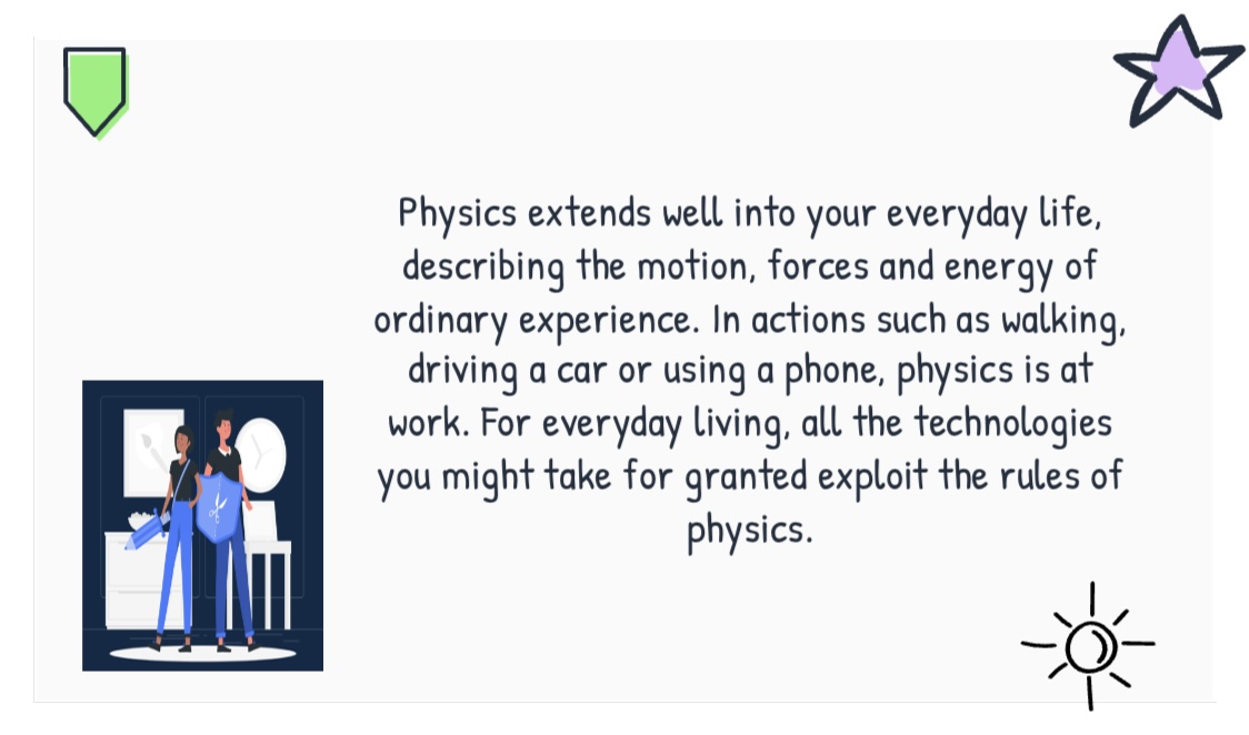 تزايد الاهتمام بعلم الفيزياء وربطه بكل الأنماط الحياتية مثل المشي أو قيادة السيارة أو استخدام الهاتف وأكثر من ذلك، فمن الأهمية سرد بعض النقاط التي ترتبط بهذا العلم، حيث أقامت وحدة التدريب والخدمة المجتمعية بالتعاون مع قسم الكيمياء تحت رعاية عميدة كلية العلوم والدراسات الإنسانية بحوطة بني تميم د. حصة بنت سعود الهزاني محاضرة بعنوان "الفيزياء في حياتنا اليومية" في تمام الساعة الثامنة مساءً من يوم الاثنين الموافق: 30/ 8 /1442 هـ، عبر برنامج الزووم، قدمتها طالبات من قسم نظم المعلومات تحت إشراف منسقة وحدة الخدمة المجتمعية بالقسم د. فرحة الفاضل.