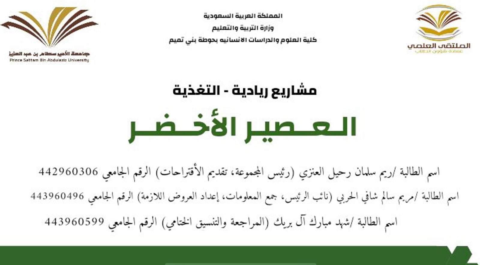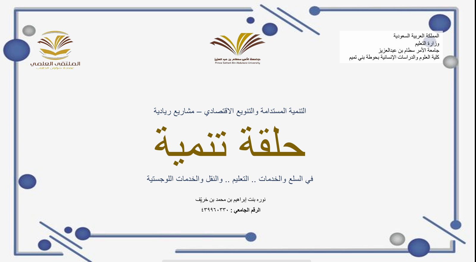 يعد الملتقى العلمي أحد الأنشطة الطلابية في عمادة شؤون الطلاب بجامعة الأمير سطام بن عبد العزيز، حيث يسلط الضوء على مواهب الطلاب في عدد من الجوانب العلمية والعملية والإنسانية، من هذا المنطلق، تم تحكيم مشاركات الملتقى العلمي الطلابي للعام الجامعي ١٤٤٣هـ تحت رعاية عميدة كلية العلوم والدراسات الإنسانية بحوطة بني تميم د. حصة بنت سعود الهزاني، في يوم الأحد الموافق: ٣ شعبان ١٤٤٣هـ بمسرح الكلية، وتولى تحكيم المشاركات لجنة ضمّت كلٌ من: د. بيان السيف / د. نادية الأمين/ د. مي مصطفى/ د. أماني عبد الرزاق/ د. إبراهيم المسلم/ د. ابتسام نفخه.
