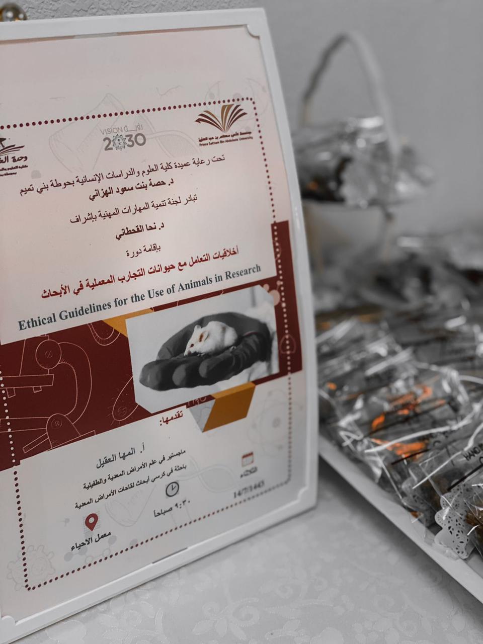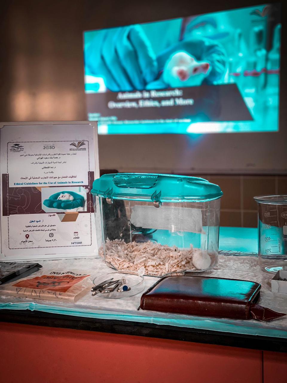 إنه لمن المعروف أن الهدف الرئيسي من إجراء التجارب على الحيوانات هو الحصول على معلومات علمية موثوق بها وذات كفاءة عالية ولا يمكن الحصول على تلك المعلومات بدون استخدام حيوانات التجارب أو استبدالها ببدائل أخرى (Replacement ) برعاية رشيدة من عميدة كلية العلوم والدراسات الإنسانية بحوطة بني تميم د/ حصة بنت سعود الهزاني أقامت لجنة تنمية المهارات المهنية بوحدة الخريجات بإشراف د/ نحا القحطاني بالتعاون مع قسم الكيمياء ورشة عمل بعنوان "أخلاقيات التعامل مع حيوانات التجارب المعملية في الأبحاث" قدمتها الأستاذة / المها بنت علي العقيل حضورياً في معمل الأحياء، وذلك يوم الثلاثاء بتاريخ 1443/7/14هـ في تمام الساعة التاسعة والنصف صباحًا. هدفت ورشة العمل إلى تعريف الطالبات بالأمور التي يجب عليهن مراعاتها عند استخدامهن لحيوانات التجارب وهي أن يستخدم أقل عدد ممكن منها (Reduction) وأن تستخدم تلك الحيوانات على النحو الأمثلRefinement) ) ويجب عليهن أيضاً وضع خطة تفصيلية موضح بها طرق البحث والعمليات المستخدمة مع ضرورة الالتزام بالمعايير التالية: أولًا: - المحافظة على حيوانات التجارب من قبل الباحثين مع ضرورة الاعتراف بحماية هذه الكائنات الحية من الألم. ثانياً: - مراعاة التخطيط العلمي والحذر لأي تجارب تجري على الحيوانات. ثالثاً: - مراجعة المتخصصين في صحة حيوانات التجارب لمعرفة حالتها قبل وأثناء وفي نهاية التجارب حفاظا على الصحة العامة للعاملين عليها ولضمان عدم انتشار العدوى بين الحيوانات أو المتعاملين معها. رابعًا: - استخدام خيارات بديلة إن أمكن في إجراء التجارب مثل استخدام مزارع الخلايا والأنسجة أو تجارب محاكاة الكترونية كبديل للحيوانات. خامساً: - عدم إجراء التجارب على الحيوانات المعرضة للانقراض. سادسًا: - الاهتمام بمسكن الحيوان من حيث أماكن التربية والتغذية والتهوية والرعاية الصحية الدورية والتخلص من النفايات بطريقة آمنة من أجل تجنب العدوى وحرصا على صحة الحيوان. سابعًا: - تدريب القائمين على رعاية الحيوان لتوفير رعاية دورية مستدامة له. ثامنًا: - عدم إعادة استخدام حيوانات التجارب مرة أخري إذا كان قد تم استخدامها من قبل. تاسعاً: - استخدام القتل الرحيم للحيوانات بعد انتهاء إجراء التجارب.