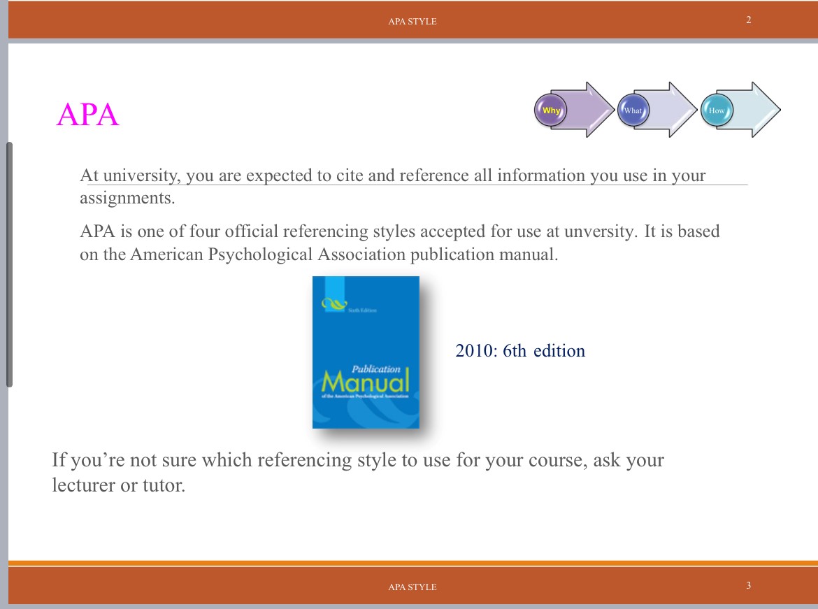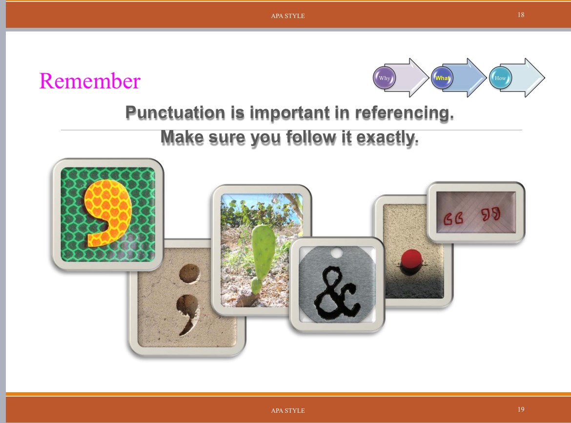 وتم إلقاء الضوء على عدة أساليب، أهمها أسلوب توثيق المراجع لجمعية علماء النفس الأمريكية (APA) مع شرح لعدة أمثلة تطبيقية باختلاف المصدر المقتبس منه، كما تم التنويه إلى ضرورة الالتزام بنفس الآلية المستخدمة على مدار كافة فصول المشروع.