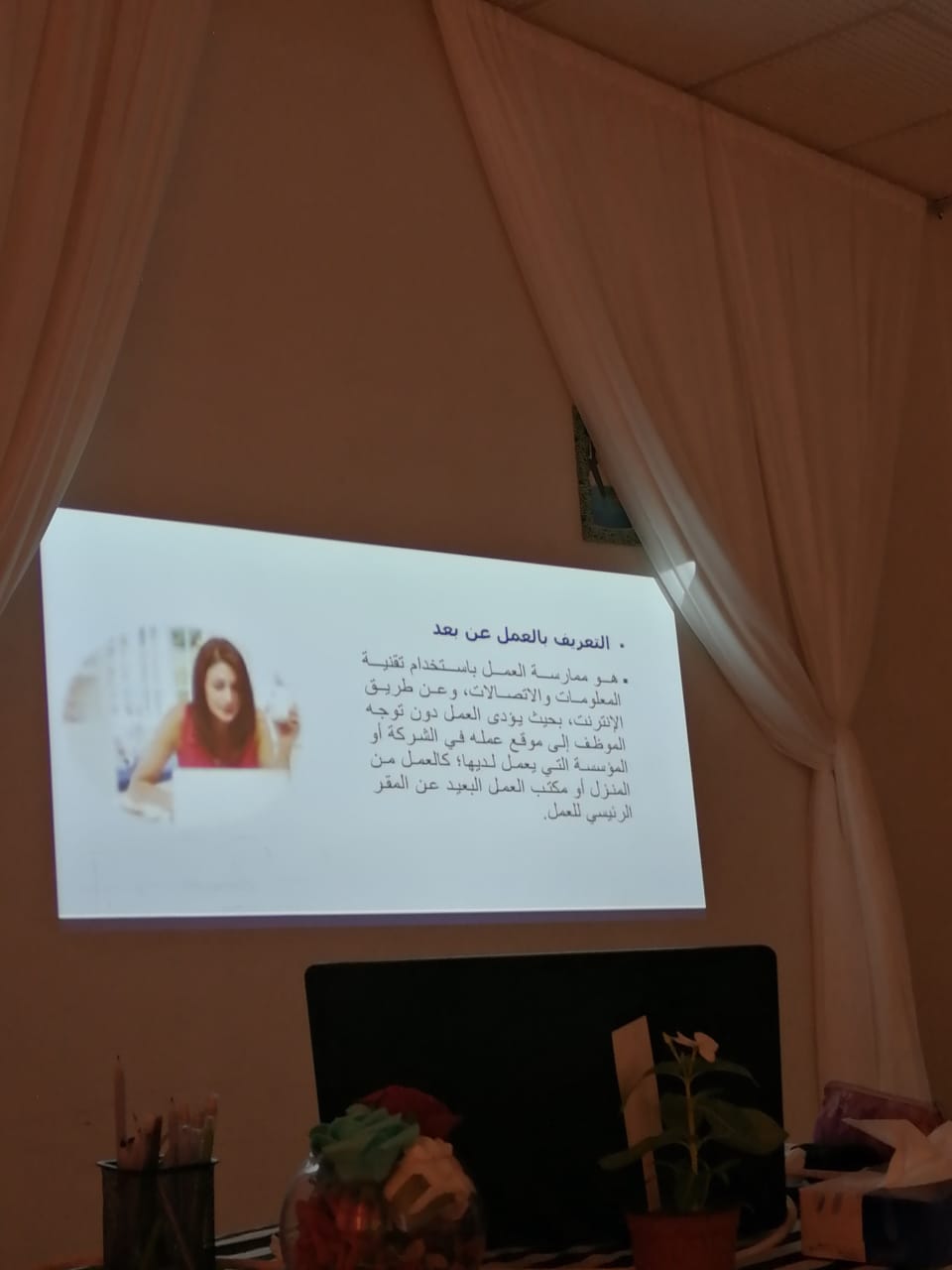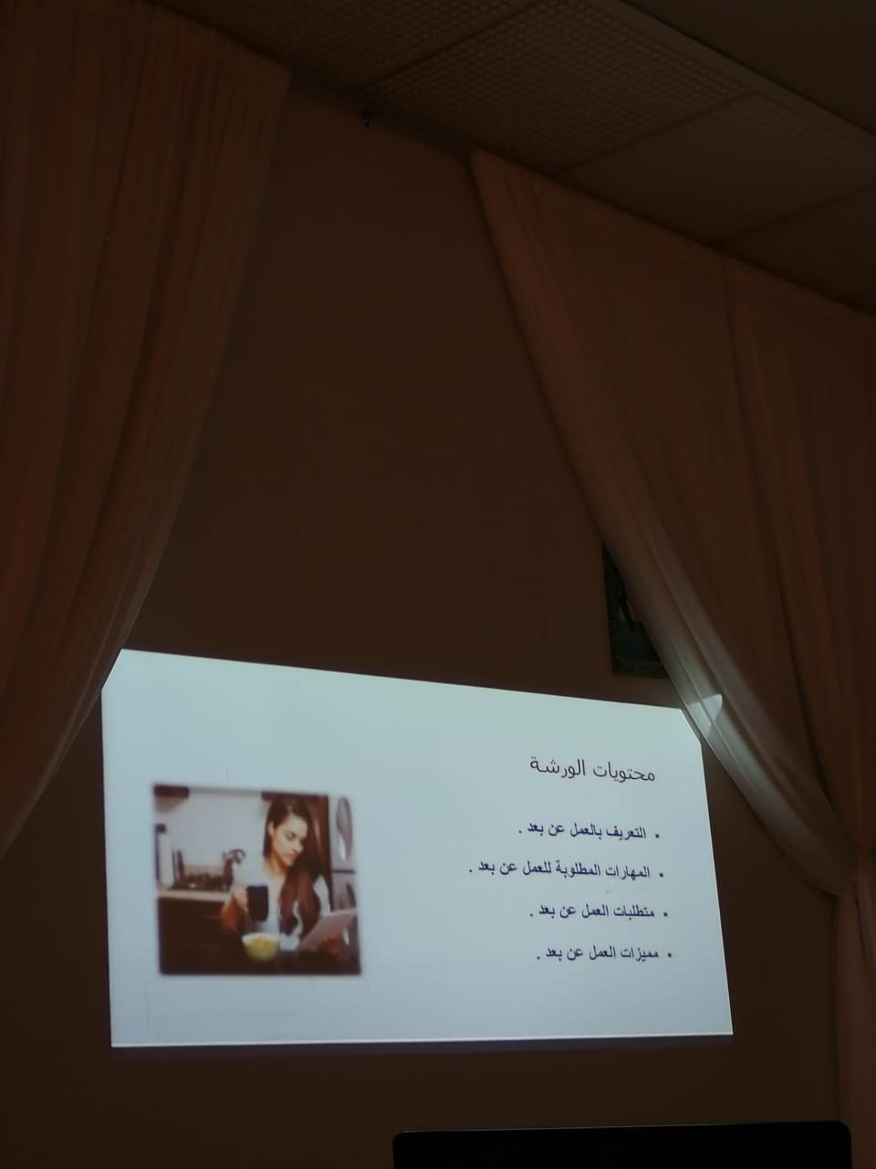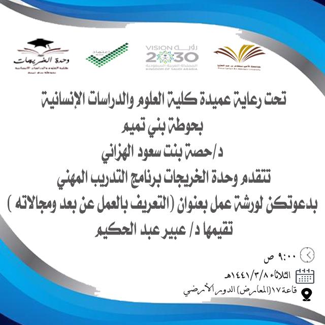 أقامت وحدة الخريجات ممثلة في برنامج التدريب المهني ورشة عمل بعنوان (التعريف بالعمل عن بعد ومجالاته) تحت قيادة عميدة الكلية سعادة الدكتورة/ حصة بنت سعود الهزاني، وذلك في يوم الثلاثاء الموافق: 1441/3/8هـ في قاعة المعارض بالكلية، قدمتها الأستاذة/عبير عبدالحكيم، الأستاذ المحاضر بقسم اللغة العربية. وقد حضر الورشة عدد من الطالبات، تعرفن على ماهية العمل عن بعد، والمهارات التي يتطلبها، ومميزاته، والأعمال المناسبة له، وختمت الورشة بعوامل نجاح هذا النوع من الأعمال الحرة. وقد حظي البرنامج بالتفاعل والايجابية والقبول من الجميع.