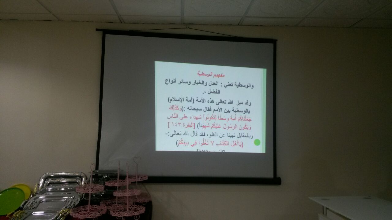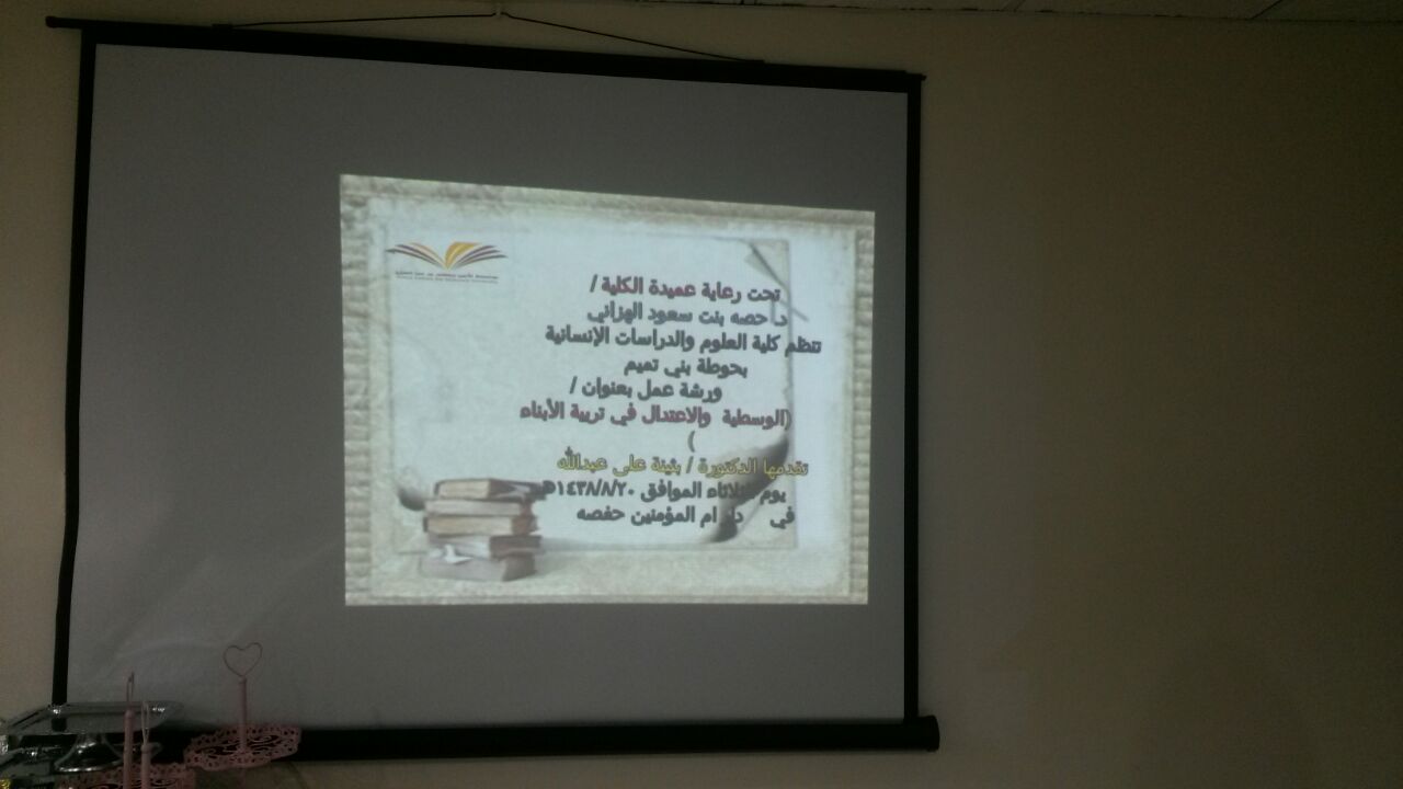تحت رعاية عميدة كلية العلوم والدراسات الإنسانية بحوطة بني تميم الدكتورة حصة بنت سعود الهزاني، أقامت وحدة التوعية الفكرية بالكلية محاضرة بمكتب الدعوة والإرشاد وتوعية الجاليات بمحافظة حوطة بني تميم بعنوان (الوسطية والاعتدال في تربية الأبناء) ألقتها الدكتورة بثينة فرح الأستاذ المساعد بقسم القرآن الكريم والدراسات الإسلامية بالكلية وذلك يوم الثلاثاء الموافق ٢٠/ ٨/ ١٤٣٨هـ، وكانت تهدف إلى: توضيح مفهوم الوسطية في اللغة والاصطلاح والأسس السليمة التي تقوم عليها الأسرة كما تهدف المحاضرة إلى بيان دور الأسرة في تربية الأبناء والمفاهيم الأساسية التي يبنى عليها منهج الوسطية في تربية الأبناء. اشتملت المحاضرة على مسابقات مع أ. فوزية الجمعة تفاعلن معها الحاضرات البالغ عددهن ٣٢ تقريبا.