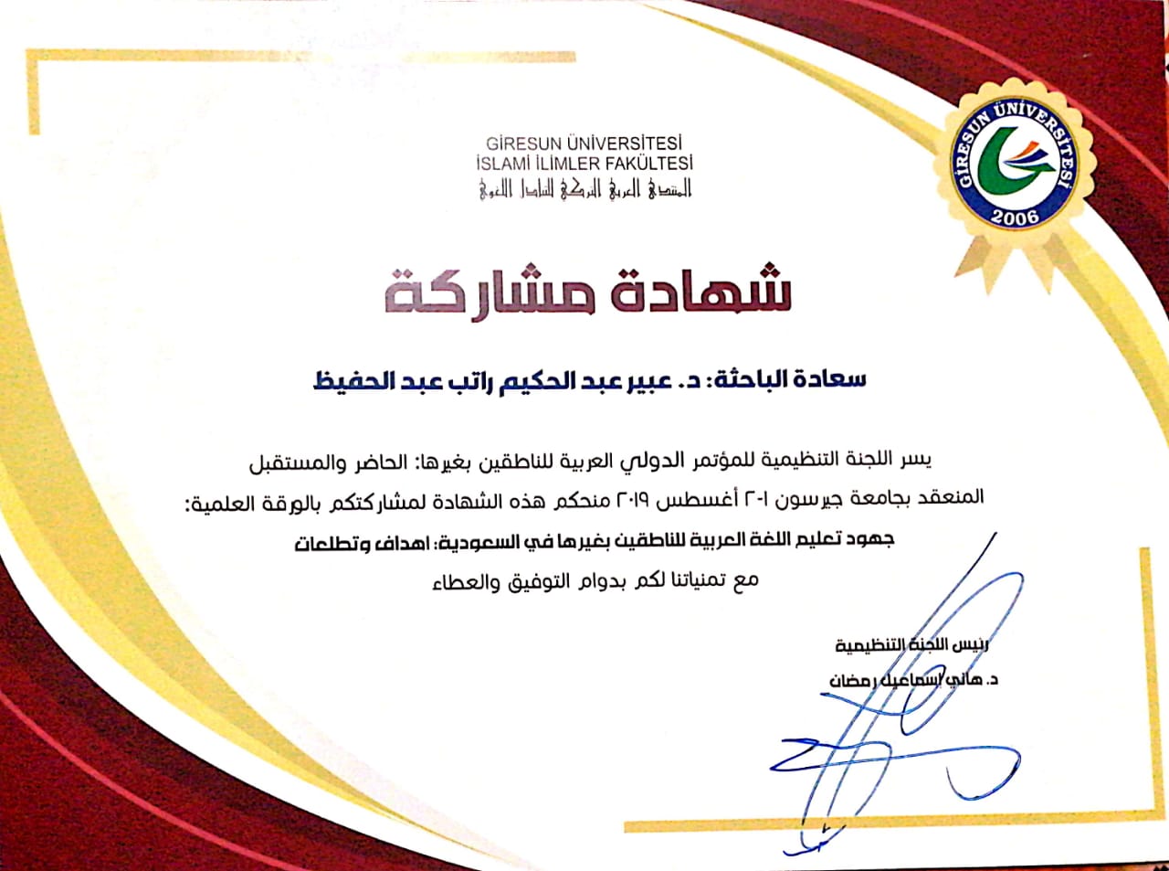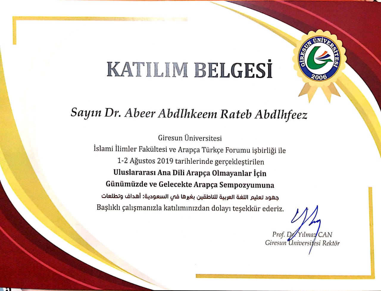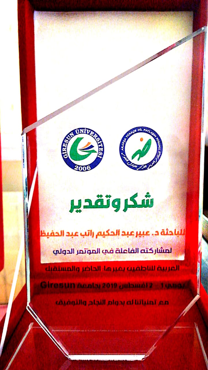 ضمن فعاليات المؤتمر الدولي الأول للمنتدى العربي التركي للتبادل اللغوي "العربية للناطقين بغيرها: الحاضر والمستقبل" المنعقد في الفترة ١ -٢أغسطس2019م بجامعة " جيرسون التركية، وبمشاركة أكثر من مائة اكاديمي وباحث من شتى دول العالم، شاركت د.عبير عبد الحكيم راتب عضو هيئة التدريس بقسم اللغة العربية بكلية العلوم والدراسات الانسانية بمحافظة حوطة بني تميم ببحث علمي بعنوان:( جهود تعليم اللغة العربية للناطقين بغيرها في" المملكة العربية السعودية: حقائق وتطلعات). كانت المشاركة بالبحث مع حضور الجلسات والنقاشات، منحت على أثرها شهادة مشاركة من إدارة المؤتمر الدولي وأيضا درع شكر وتقدير من المنتدى لمشاركتها الفاعلة. ويضاف هذا الإنجاز إلى إنجازات منسوبات كلية العلوم والدراسات الانسانية بحوطة بني تميم. بهذه المناسبة تتقدم د. عبير عبد الحكيم راتب بخالص شكرها وتقديرها لجامعة الأمير سطام ولعميدة الكلية د. حصة سعود الهزاني لتشجيعها الدائم للأعضاء للانخراط في المجالات البحثية والمشاركات العالمية لرفعة وترقية الأداء وتحسين العملية التعليمية للطالبات.