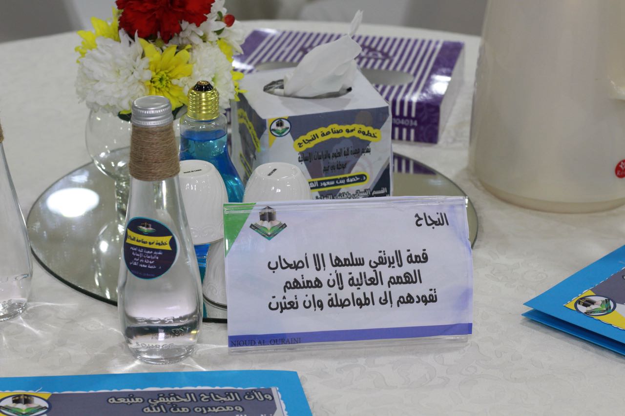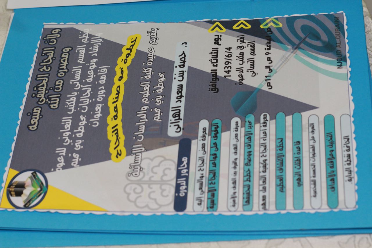 أقام المكتب التعاوني للدعوة والإرشاد وتوعية الجاليات القسم النسائي بحوطة بني تميم بقيادة مديرة القسم النسائي أ. فوزية بنت زيد الجمعة برنامج تدريبي بعنوان (خطوة نحو صناعة النجاح) بتقديم عميدة كلية العلوم والدراسات الإنسانية بحوطة بني تميم د. حصة بنت سعود الهزاني يوم الثلاثاء الموافق 11 / 6 /1439 هـ بمعدل ساعتين تدريبية من الساعة ٩ ص إلى ١١ صباحاً في قاعة القسم النسائي بمكتب الدعوة. شهدت الدروة حضوراً كبيراً وكان من أهم المحاور الأساسية خلالها: -