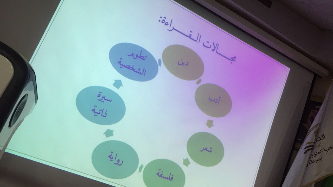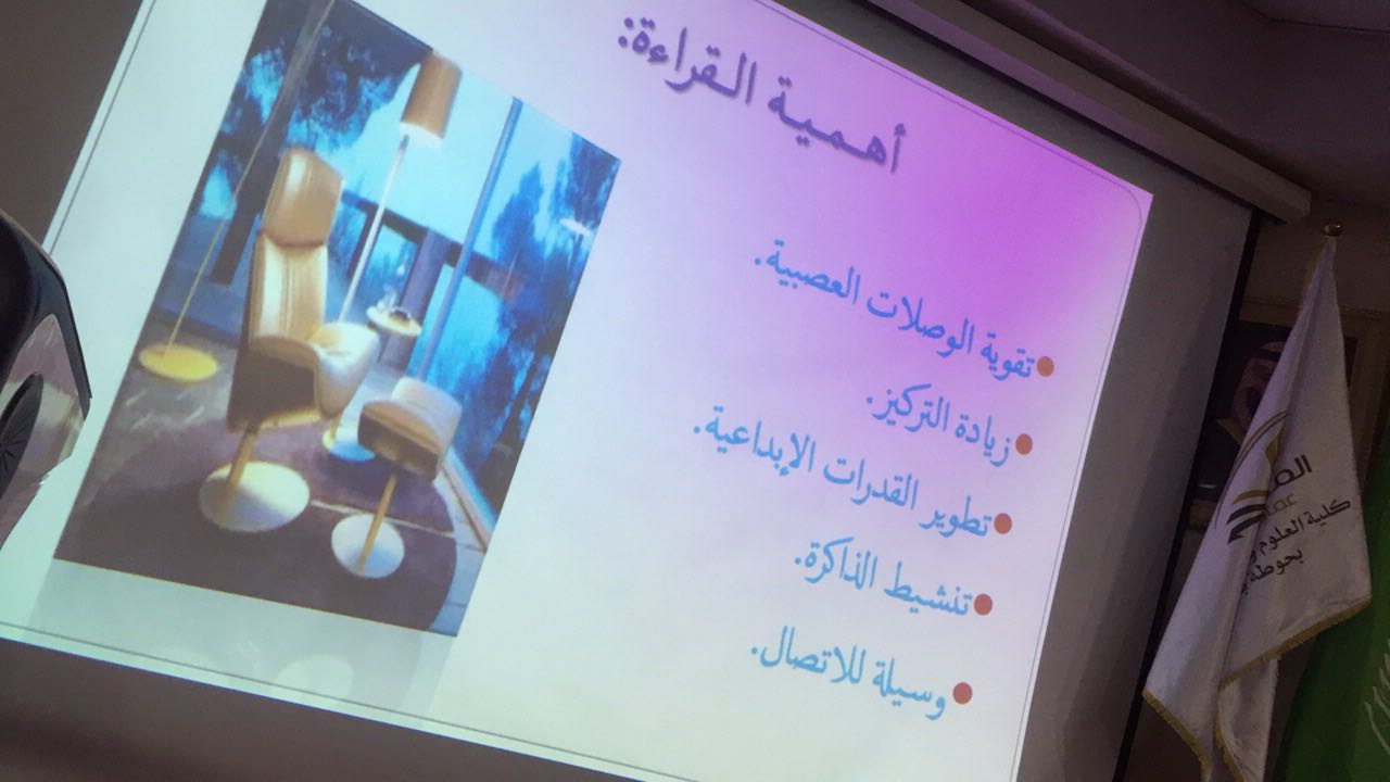 تحت رعاية عميدة كلية العلوم والدراسات الإنسانية بحوطة بني تميم د. حصة بنت سعود الهزاني، نظم نادي القراءة متمثلاً بمشرفته أ.بثينه الضفيان فعالية قارئة قمن بإعدادها أعضاء نادي القراءة خلال يوم الثلاثاء –الموافق 11 / 6 /1439 هـ – (11:30 م – 12:30 م) في مسرح الكلية. يهدف البرنامج إلى تعريف الطالبات بأهمية القراءة ودورها في بناء المجتمعات المتقدمة وقد تضمن البرنامج المحاور الأتية: