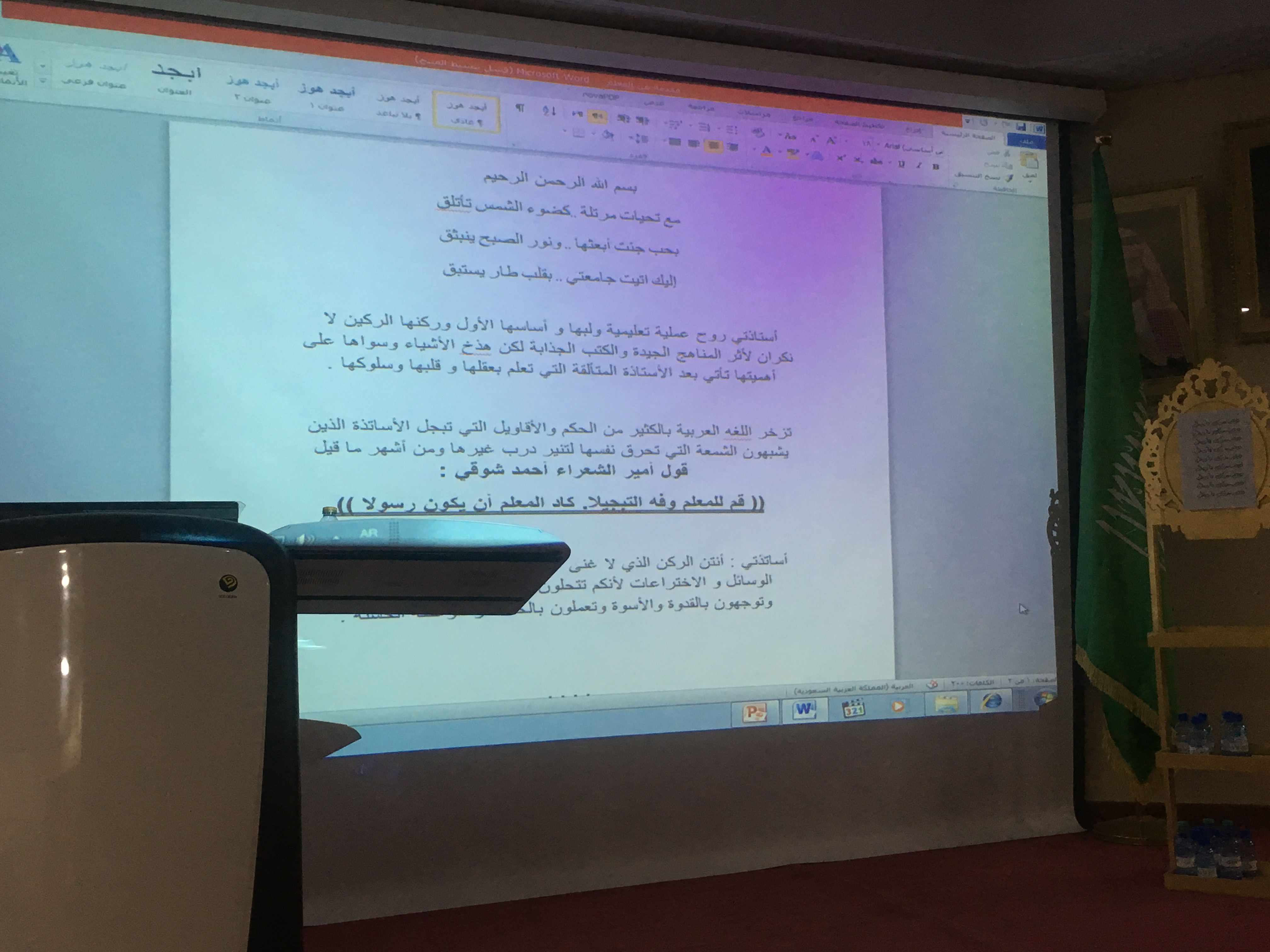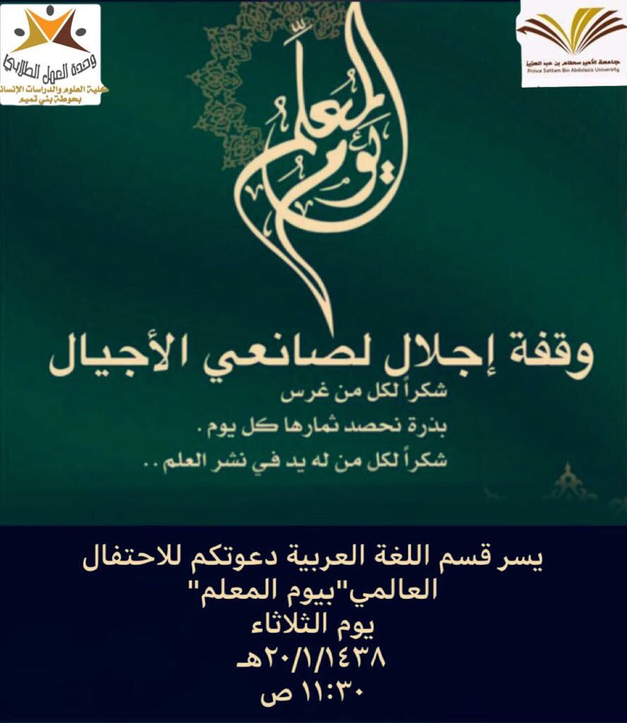 تحت رعاية عميدة كلية العلوم والدراسات الإنسانية بحوطة بني تميم الدكتورة حصة بنت سعود الهزاني و بالتعاون مع وحدة العمل الطلابي قدم قسم اللغة العربية برنامج بعنوان (الاحتفال العالمي بيوم المعلم) يوم الثلاثاء الموافق 20/1/1439 في تمام الساعة 11:30صباحا بمسرح الكلية ،  حيث بدأ البرنامج بكلمة شكر وعرفان لكل معلمة ساهمت في رفع مستوى الطالبة علمياً أو تربوياً أو ثقافياً، وشارك فيها الطالبات بذكر مواقف أثرت بهن وساهمت في رسم مستقبلهن التعليمي، كما شاركت الأستاذات برسائل وتوجيهات تبين أثر المعلم وأهميته ونبل الرسالة التي يحملها. ونظم الطالبات  ركنا خاصا تقديرا لجهود المعلمة عبروا عن مشاعرهن بكلمات شكر عرفان وتبجيل للمعلمة..