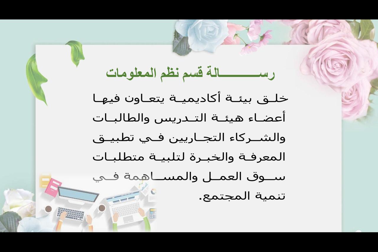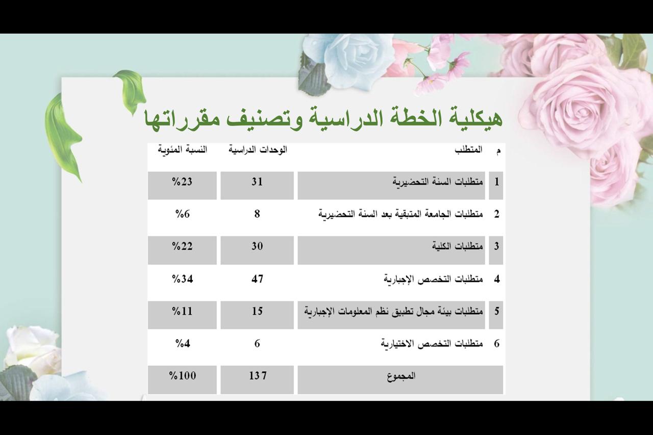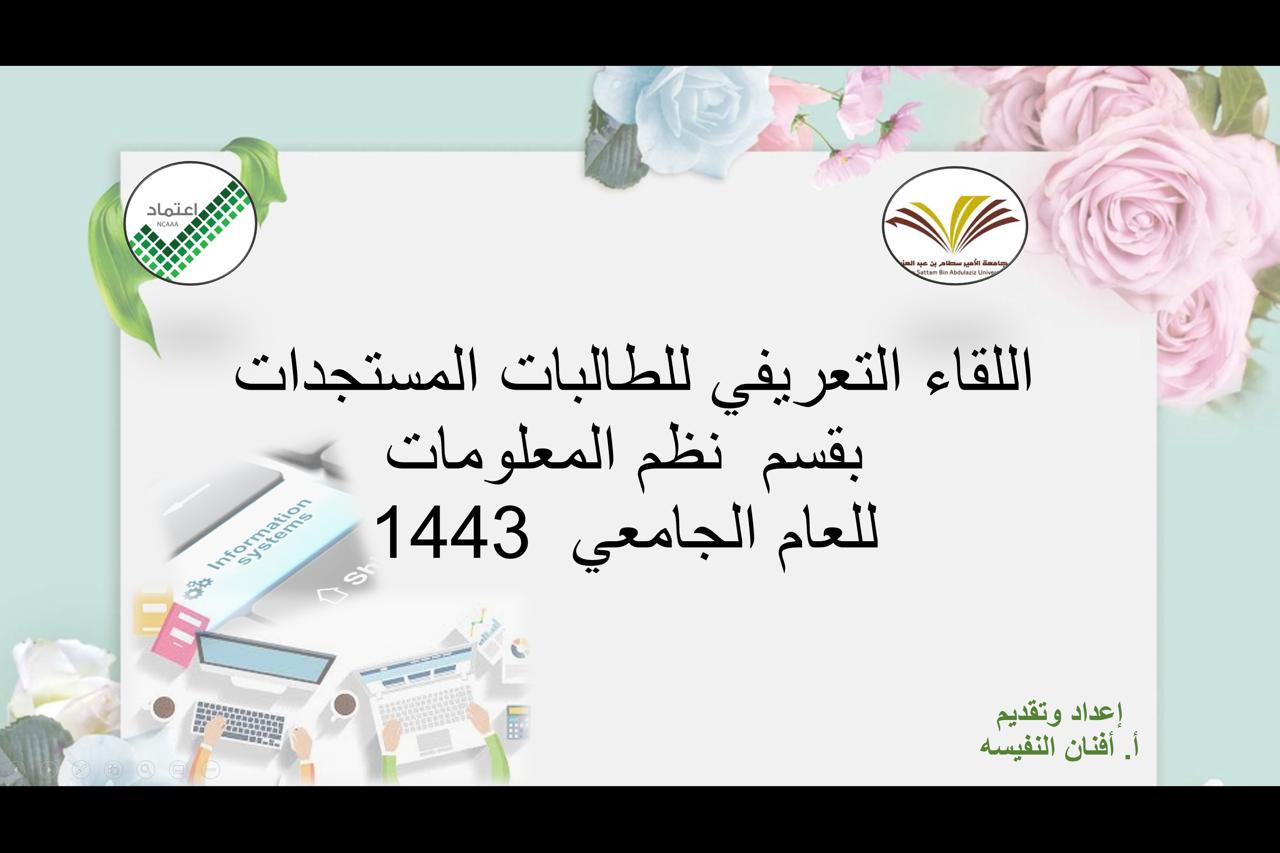 في بداية العام الدراسي الجديد، وبغرض الترحيب بالطالبات المستجدات وتعرفيهن بالأقسام وبأنظمة الجامعة، أقام قسم نظم المعلومات بكلية العلوم والدراسات الإنسانية بحوطة بني تميم تحت رعاية عميدة الكلية د. حصة بنت سعود الهزاني برنامج " اللقاء التعريفي لتهيئة الطالبات المستجدات" وذلك في يوم الأربعاء الموافق: ٨/ ٢/ ١٤٤٣هـ في تمام الساعة السابعة مساءً عن بعد عبر نظام البلاك بورد.  حيث بدأ البرنامج بآيات من الذكر الحكيم يليه فيديو ترحيبي بالطالبات المستجدات وتهنئتهن بالعام الدراسي الجديد ثم بدأت أ. أفنان النفيسه منسقة النشاط الطلابي بالقسم بالترحيب بالطالبات ومن ثم تحدثت عن قسم نظم المعلومات ورؤيته ورسالته والأهداف والمخرجات التعليمية للبرنامج، كما شرحت نظام الدراسة في قسم نظم المعلومات والمتطلبات التي يجب أن تكملها الطالبة للحصول علي الشهادة والتخرج، ووضحت هيكلية الخطة الدراسية وتصنيف مقرراتها كما وضحت الفرص الوظيفية للطالبة عند التخرج من البرنامج، وعرضت قائمة بأسماء أعضاء هيئة التدريس والبريد الإلكتروني لهن، ووسائل التواصل المختلفة  لرئيسة القسم، كما ألقت رئيسة القسم د. هبة  الله أحمد الويشي كلمتها ابتدأتها بالترحيب بالطالبات واعطتهن بعض النصائح  التي تساعدهن في مرحلتهن الجامعية ودراستهن الأكاديمية وتحدثت عن القسم و قواعد الالتزام بالشكل العام وبالحضور وغيره من النقاط التي تهم الطالبات المستجدات، كما تحدثت د. أميرة العثمان منسقة الإرشاد الأكاديمي، و أ. تغريد المدني منسقة الوحدة المجتمعية، و أ. فاطمة السرحان منسقة التطوير والجودة، وأ. نازرين حسين منسقة مشاريع التخرج، و أ. سارة محمد صالح منسقة الحقوق الطلابية، و أ. وفاء حمزة منسقة التدريب الميداني، كما تم إعطاء المجال للطالبات لتقديم اسئلتهن و استفسارتهن والإجابة عليها، وتم اختتام اللقاء بشكر الطالبات على حضورهن.