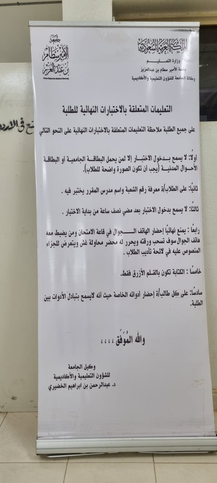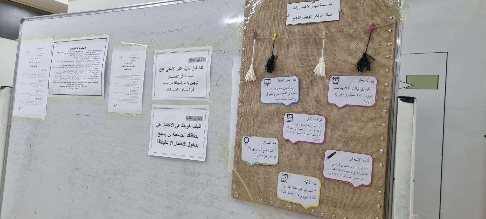 هذا وقد تم تزويد الطالبات بأهم التعليمات الأساسية المتعلقة بالاختبارات من خلال البنرات وإعلانات الحائط قبل الاختبارات. وفي ختام الجولة شكرت الدكتورة جميع المنسوبات على الجهود المقدمة متمنية لجميع الطالبات التوفيق والنجاح.