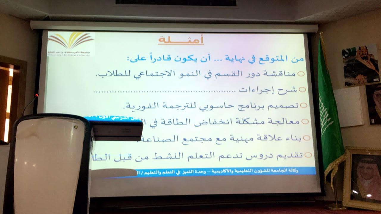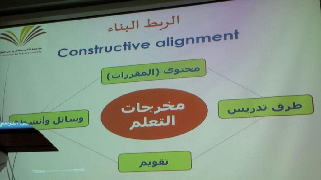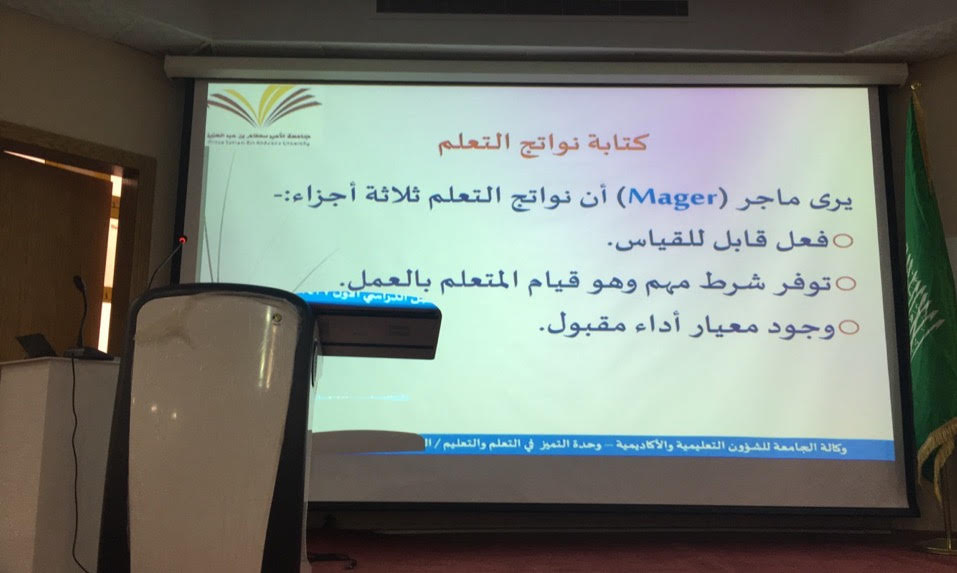 برعاية سعادة وكيل الجامعة للشؤون التعليمية والأكاديمية الدكتور عبدالرحمن الخضيري أقامت وكالة الجامعة للشؤون التعليمية والأكاديمية ممثلة بالدكتور يسري عطيه محمد أبو العينين مستشار وكالة الجامعة للشؤون التعليمية والأكاديمية ورشة عمل بعنوان (صياغة نواتج التعلم المستهدفة) ضمن برنامجها التدريبي الأول لكليات حوطة بني تميم (كلية العلوم والدراسات الإنسانية - كلية إدارة الأعمال) بمبنى كلية العلوم والدراسات الإنسانية بحوطة بني تميم بإشراف وتنظيم سعادة عميدة الكلية د. حصة الهزاني، حيث تناولت الورشة عدة محاور: