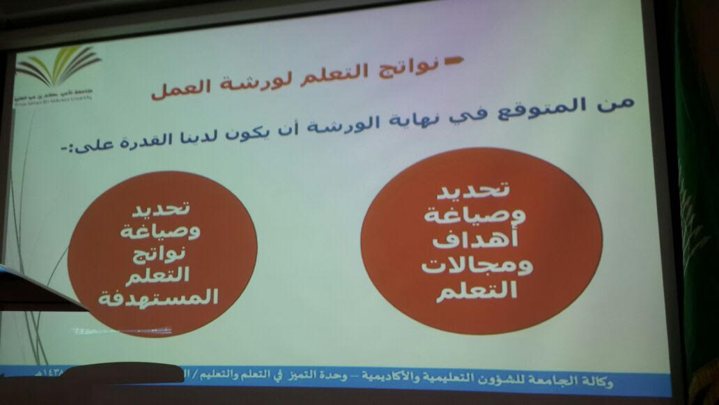 وتناول المحور الأول مكونات الهدف وشروط صياغته وكذلك مستويات الأهداف ومجالاتها وطرق صياغتها، كما تناول المحور الثاني الاعتبارات التي يجب أن نتخذها في الاعتبار عند صياغة نواتج التعلم بالإضافة إلى مكونات ناتج التعلم مع أمثلة تطبيقية على مجالاتها وفقاً للإطار الوطني للمؤهلات.