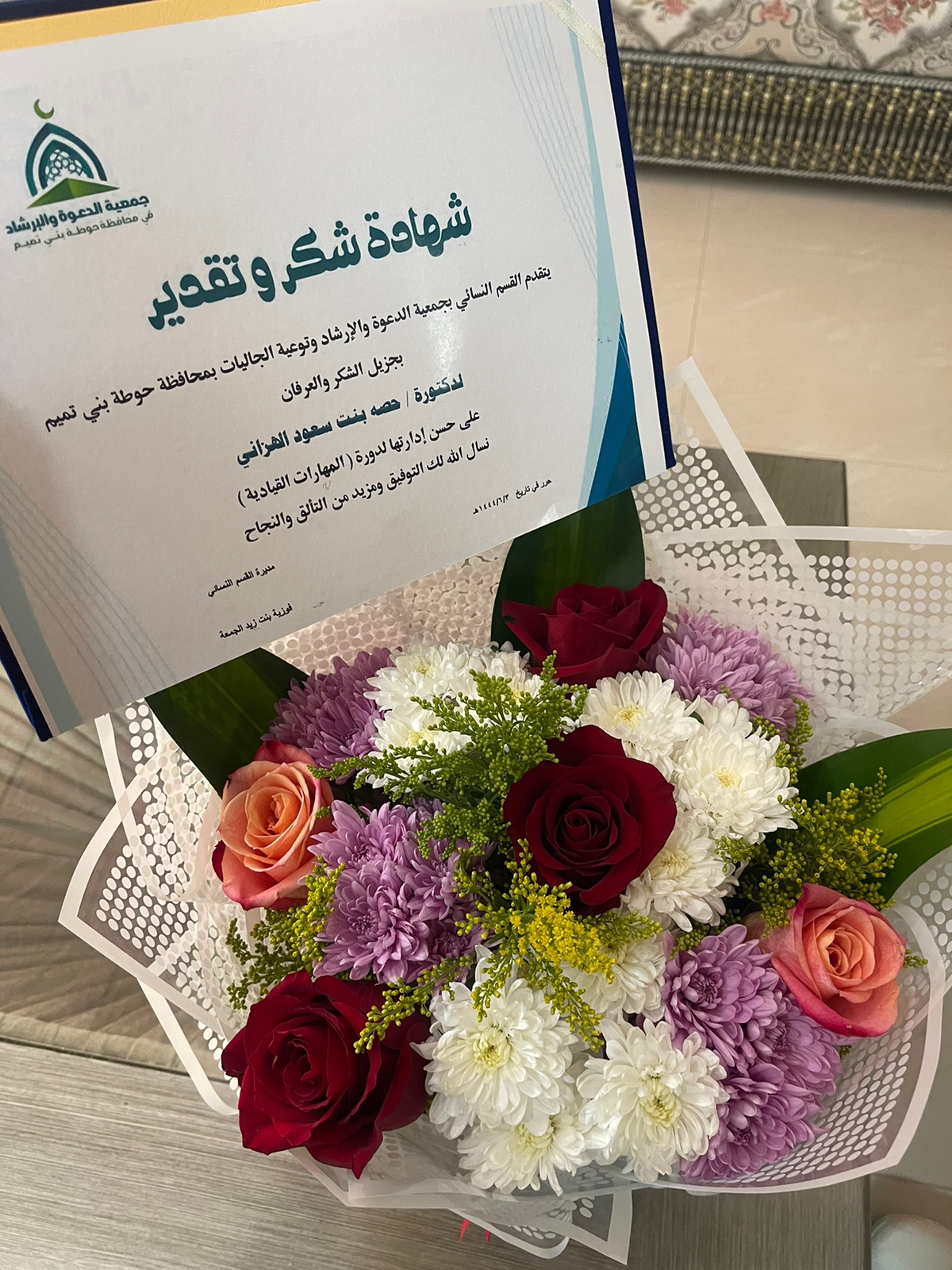 وفي ختام الدورة شكرت مديرة القسم النسائي عميدة الكلية وقدمت لها شهادة شكر على عطائها.