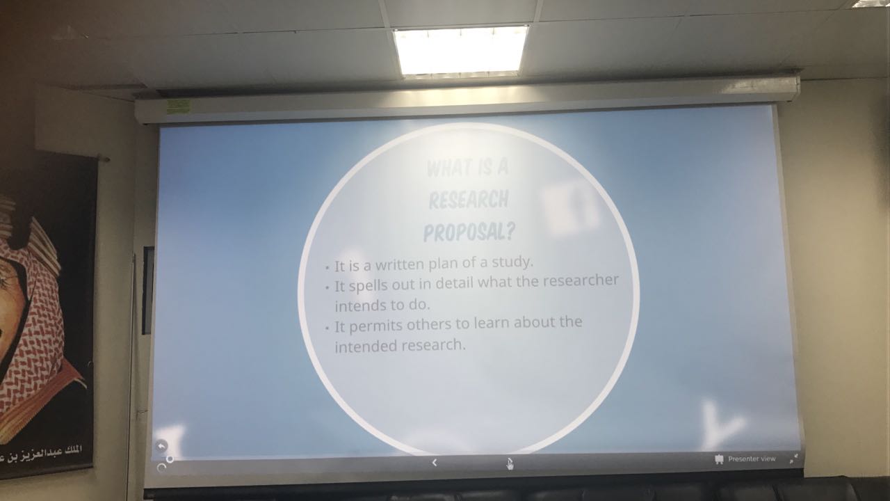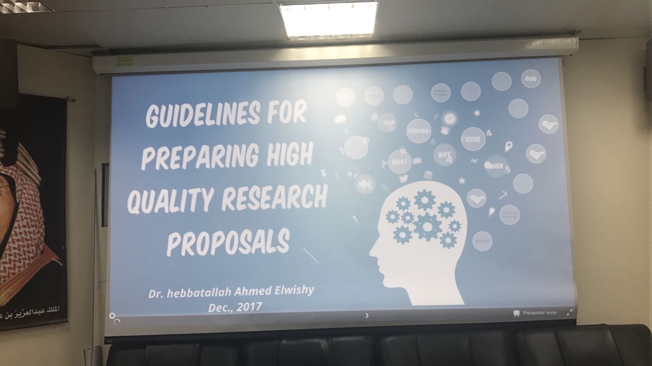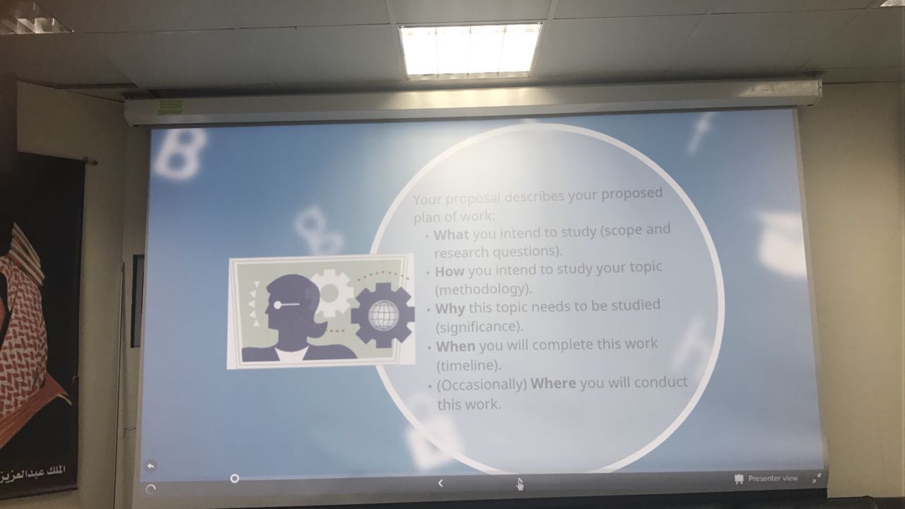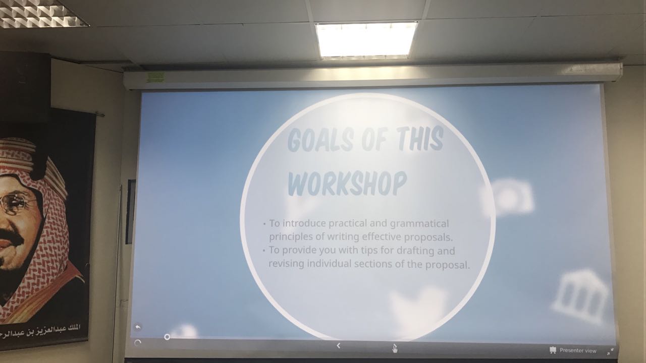و قد استغرقت الورشة ساعتين بقاعة الاجتماعات و تضمنت إلقاء الضوء على المكونات الأساسية للمقترح البحثي مع التركيز على الأخطاء الشائعة التي تواجهها الطالبات في صياغة المقترحات البحثية و كيفية تلافيها من خلال إرشادات موجهة بالتطبيق على بعض الأمثلة العملية و اختتمت الورشة بنقاش مفتوح مع الحضور من الطالبات و عضوات هيئة التدريس حول المقترحات البحثية المقدمة.
