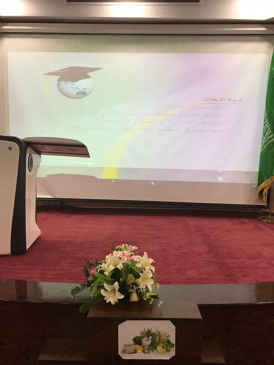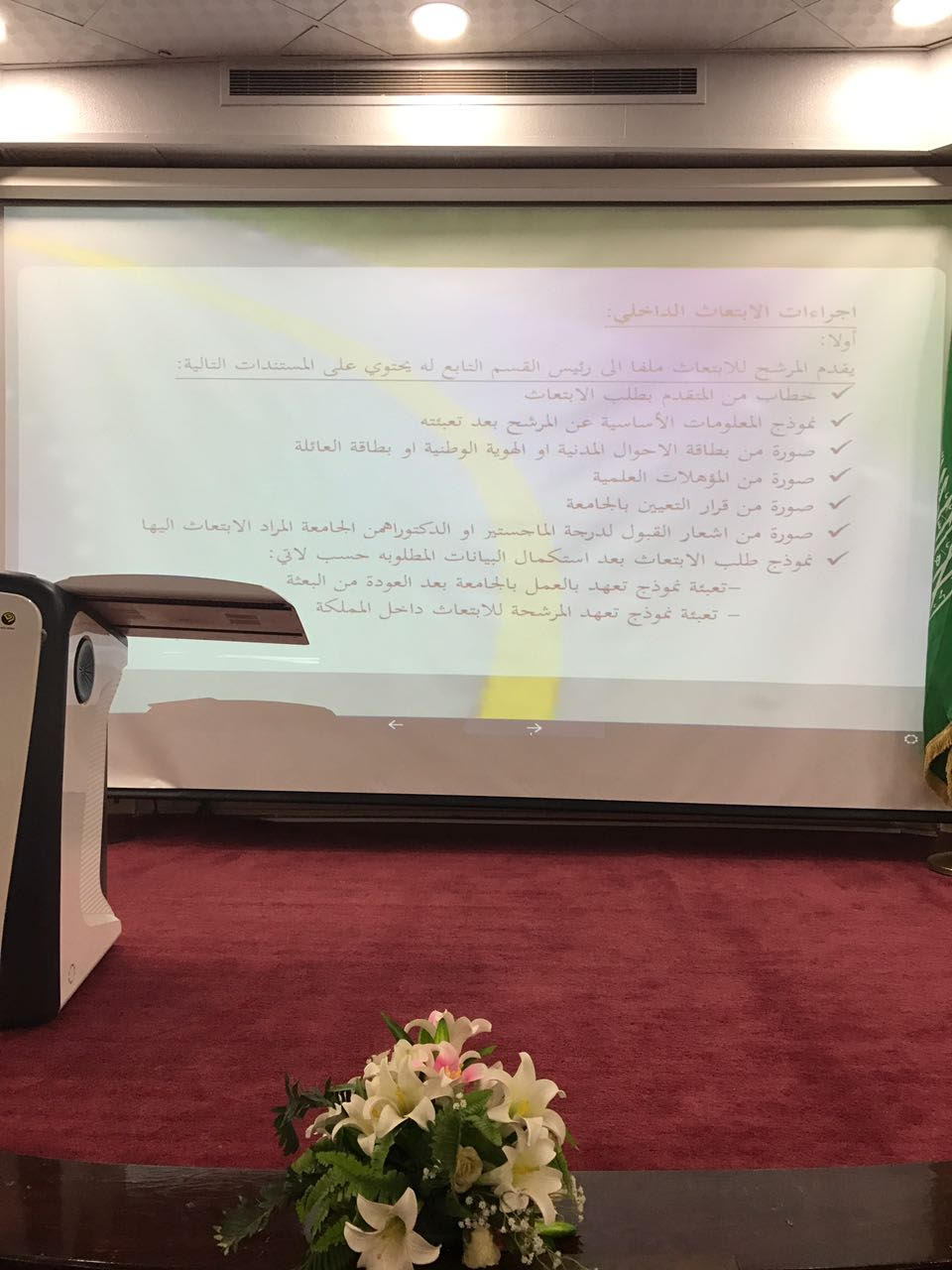 أقامت وحدة الابتعاث بكلية العلوم والدراسات الانسانية بحوطة بني تميم يوم الثلاثاء الموافق ١٤٣٨/٣/٢١هـ ورشة عمل بعنوان (الابتعاث الداخلي إجراءاته وأحكامه) بمسرح الكلية في تمام الساعة الحادية عشر صباحًا، قدمت من خلالها رئيسة وحدة الابتعاث ا.أروى الداود شرحًا تفصيليًا عن أبرز الإجراءات التي يتم اتخاذها قبل وخلال وبعد فترة الابتعاث وتم عرض الشروط اللازمة للابتعاث والمستحقات المالية المتعلقة بالمبتعثات كما تم عمل لقاء بسيط مع إحدى عضوات هيئة التدريس بالكلية والتي تم ابتعاثها داخليا لعرض تجربتها وتقديم النصائح اللازمة لزميلاتها الراغبات في الابتعاث هذا وقد حضر الورشة عميدة الكلية د. حصة الهزاني وعدد من رئيسات الأقسام وعضوات هيئة التدريس والإداريات وبعض الطالبات مبديات استفادتهن ورضاهن عن ماتم تقديمه خلال الورشة.