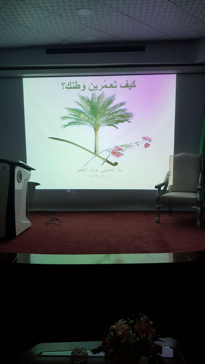 نظّم قسم القرآن الكريم والدراسات الإسلامية في كلية العلوم والدراسات الإنسانية بحوطة بني تميم بالتعاون مع وحدة العمل الطلابي برنامجاً بعنوان (يدٌ تحمي ويدٌ تعمر) يوم الاثنين 10 صفر 1439 هـ تحت رعاية عميدة الكلية د. حصة بنت سعود الهزاني. احتوى البرنامج على عرضٍ لمقتطفات من حياة جنودنا البواسل على الحد الجنوبي وتحدثن فيه الطالبات عن فضل الرباط في سبيل الله، ودور المواطن تجاه الجنود ورجال الأمن، ثم أُلقيت قصيدة في هذا الموضوع، وخُتم البرنامج بكلمة عن دور المواطن في بناء وطنه ورفعة مجتمعه وزار الحضور بعد ذلك الركن المساند للبرنامج