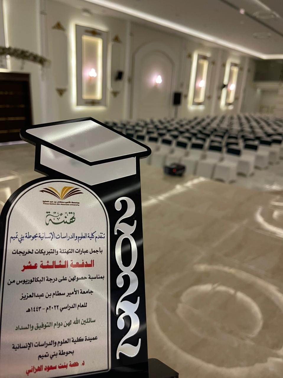 The College of Sciences and Human Studies in Hotat Bani Tamim organized the graduation ceremony of the thirteenth undergraduate college students under the supervision of the Dean of the College, Dr. Hessa bint Saud Al-Hazani, on Wednesday 10/24/1443 AH. The ceremony began with announcing the first and second ranks of honor by students who are expected to graduate.