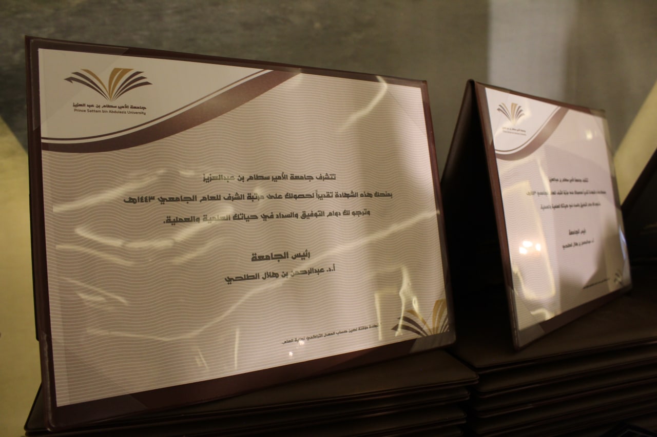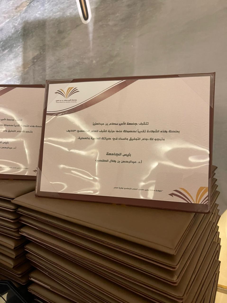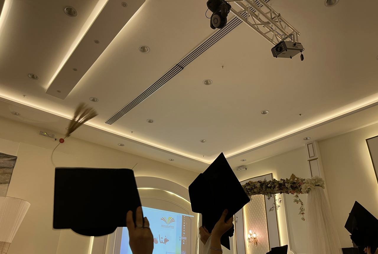 Then presentation of the Holy Qur’an by student: Jewan Al-Tamimi, followed by the speech of the of the university director Dr. Abdul Rahman bin Hilal Al-Talhi. After that, the Dean of the College, Dr. Hessa Al-Hazani, gave a speech on this occasion. Next, the student, Balqis Al-Tamimi, gave the speech of the graduates. On their behalf, she thanked the guests from the college leaders for their participation of the students in this ceremony and the joy of achievement and graduation. At the end of the ceremony, the Vice Dean for Educational and Academic Affairs, Dr. Bayan Alsaif starts distribution of certificates and gifts to all graduates.